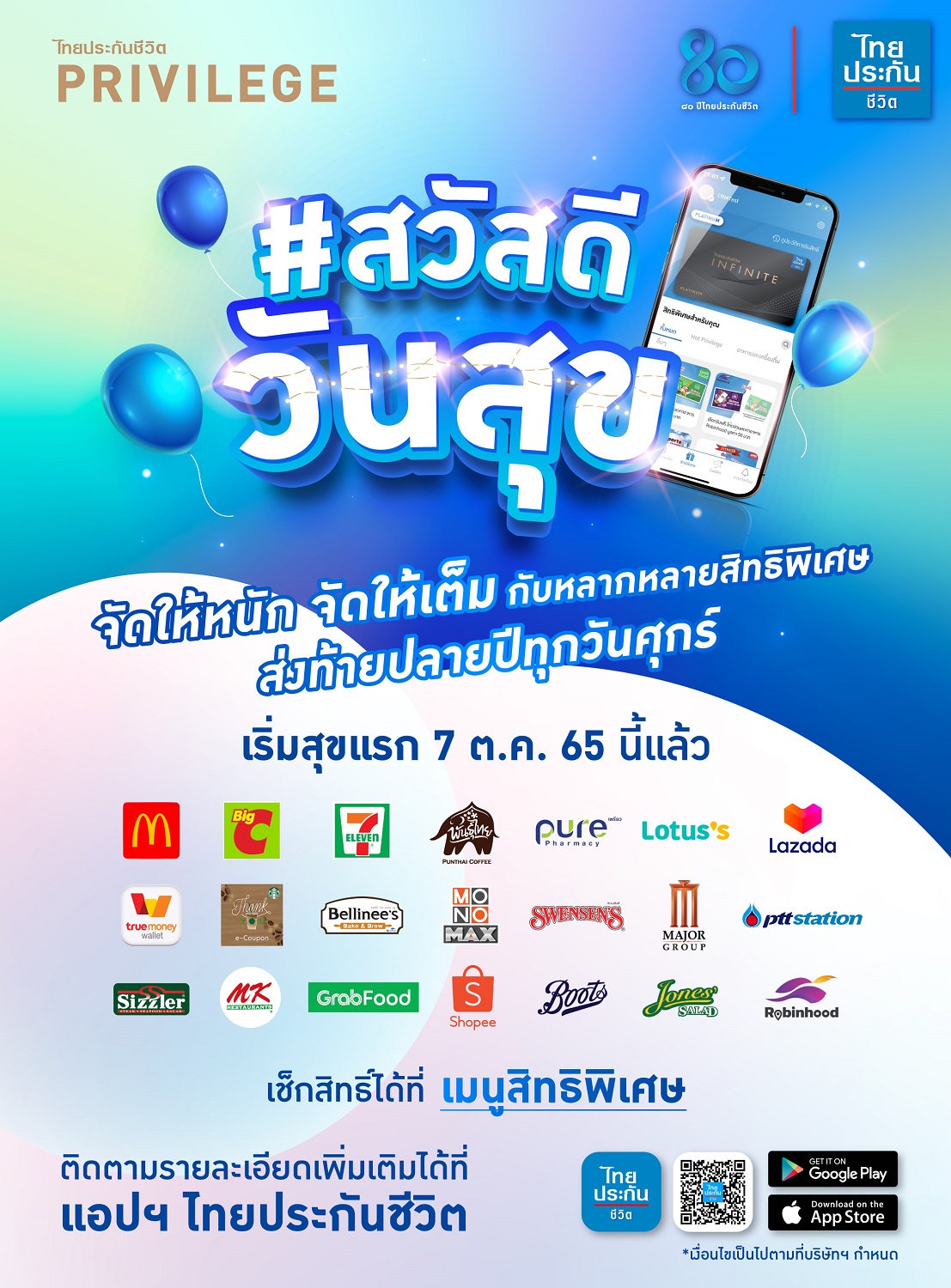 5 ตุลาคม 2565 : นายนิติพงษ์ ปรัชญานิมิต ผู้ช่วยผู้จัดการใหญ่ และ Chief Marketing Officer บริษัท ไทยประกันชีวิต จำกัด (มหาชน) หรือ TLI เปิดเผยว่า เพื่อมอบสิทธิพิเศษสำหรับลูกค้าไทยประกันชีวิต PRIVILEGE ทุกระดับ ได้แก่ ไทยประกันชีวิต INFINITE, ไทยประกันชีวิต ULTIMATE และไทยประกันชีวิต PRIME บริษัทฯ จึงได้จัดแคมเปญ “สวัสดี วันสุข 2565” มอบสิทธิพิเศษส่งท้ายปลายปีทุกวันศุกร์ โดยมอบสิทธิพิเศษจากหลากหลายแบรนด์ชั้นนำ ตั้งแต่เดือนตุลาคมถึงเดือนธันวาคม 2565