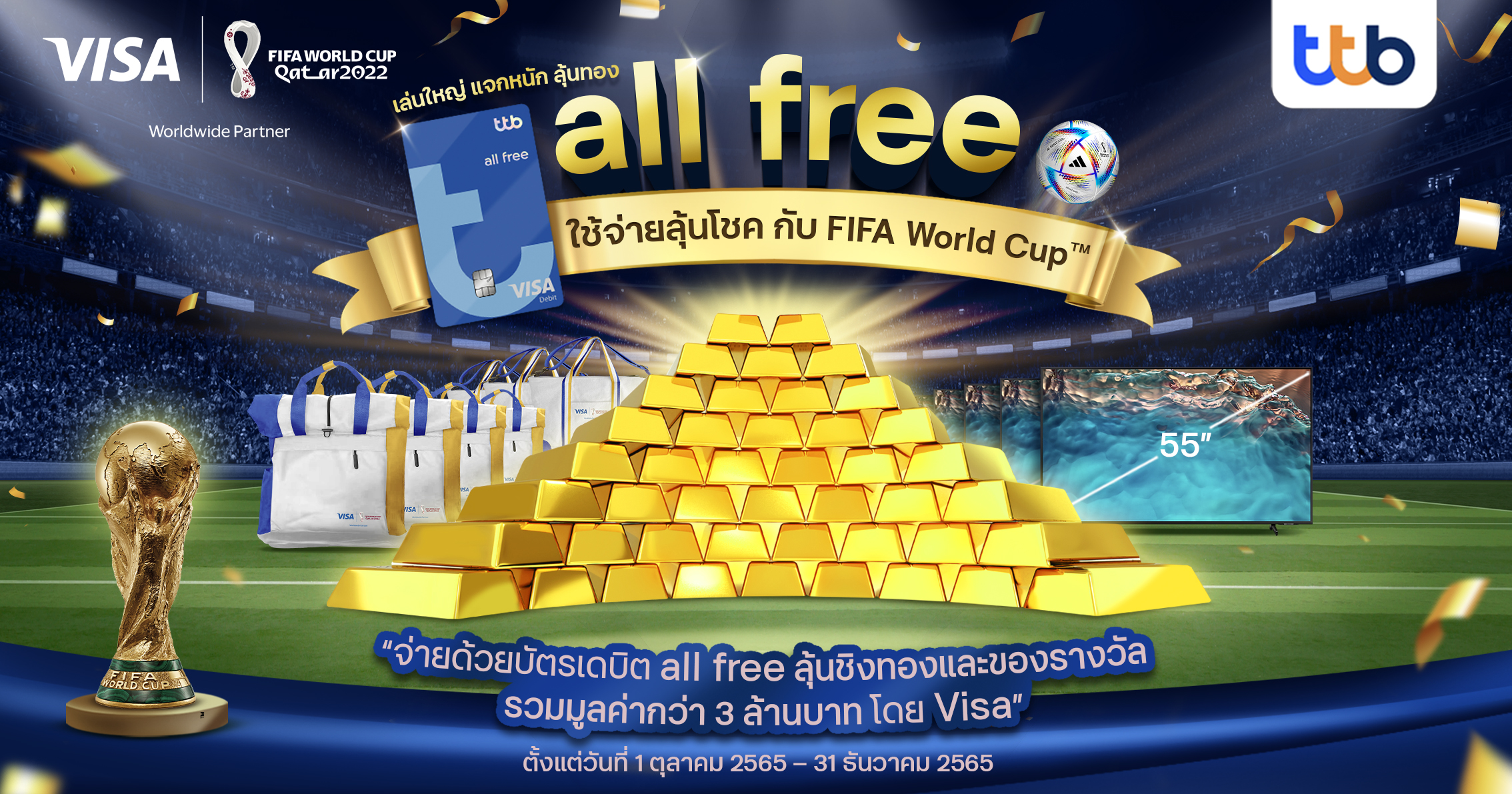 7 ตุลาคม 2565 : ทีเอ็มบีธนชาต หรือ ทีทีบี จับมือ Visa ส่งแคมเปญ ออลล์ฟรี ใช้จ่ายลุ้นโชค รับ FIFA World Cup™ ลุ้นชิงทองและของรางวัลรวมมูลค่ากว่า 3 ล้านบาท ให้ลูกค้าบัตรเดบิต ออลล์ฟรี (บัตรเดบิต ทีทีบี และบัตรเดบิต ทีเอ็มบี) ได้ร่วมลุ้นชิงรางวัล เพียงลงทะเบียนร่วมแคมเปญ