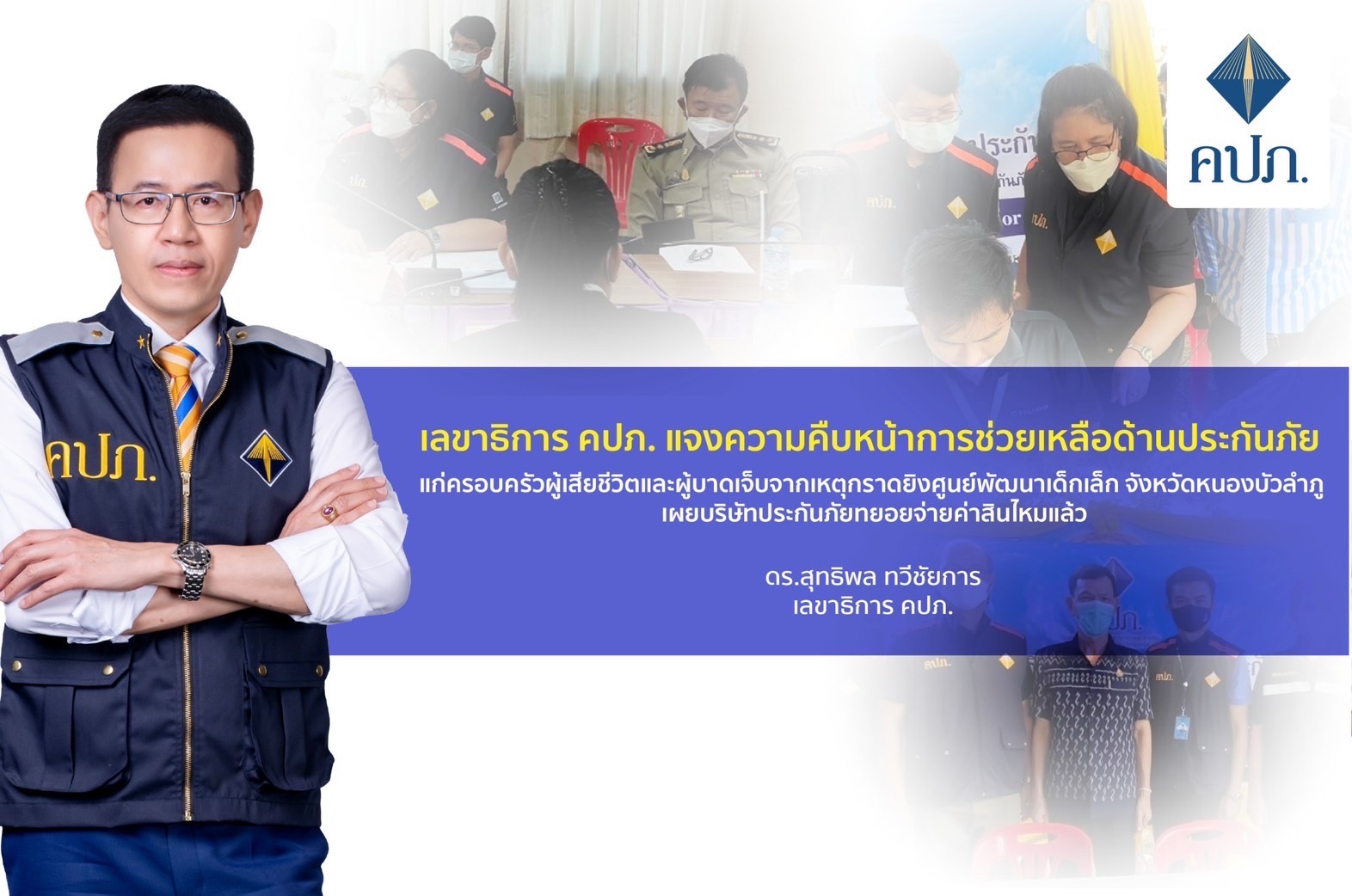 8 ตุลาคม 2565. : ดร.สุทธิพล ทวีชัยการ เลขาธิการคณะกรรมการกำกับและส่งเสริมการประกอบธุรกิจประกันภัย (เลขาธิการ คปภ.) เปิดเผยว่า กรณีเกิดเหตุกราดยิงที่จังหวัดหนองบัวลำภู ทำให้มีผู้เสียชีวิตและบาดเจ็บเป็นจำนวนมาก นายอาคม เติมพิทยาไพสิฐ รัฐมนตรีว่าการกระทรวงการคลัง ได้ห่วงใยในเรื่องนี้อย่างมากและได้กำชับให้สำนักงาน คปภ. เข้าไปช่วยเหลือดูแลอย่างเต็มที่