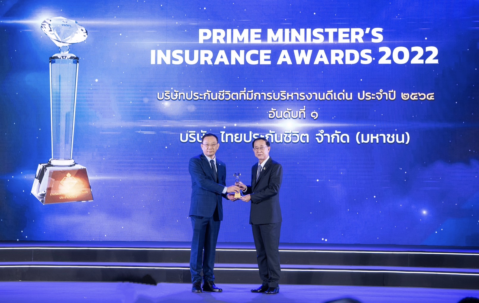 10 ตุลาคม 2565 : อาคม เติมพิทยาไพสิฐ รัฐมนตรีว่าการกระทรวงการคลัง มอบรางวัลบริษัทประกันชีวิตที่มีการบริหารงานดีเด่นอันดับ 1 ประจำปี 2564 แก่ ไชย ไชยวรรณ กรรมการและประธานเจ้าหน้าที่บริหาร บริษัท ไทยประกันชีวิต จำกัด (มหาชน) ในพิธีมอบรางวัลประกันภัยดีเด่นครบวงจร (Prime Minister’s Insurance Awards) จัดโดยสำนักงานคณะกรรมการกำกับและส่งเสริมการประกอบธุรกิจประกันภัย (คปภ.) ณ ศูนย์แสดงสินค้าและการประชุมอิมแพ็ค เมืองทองธานี ![]()
