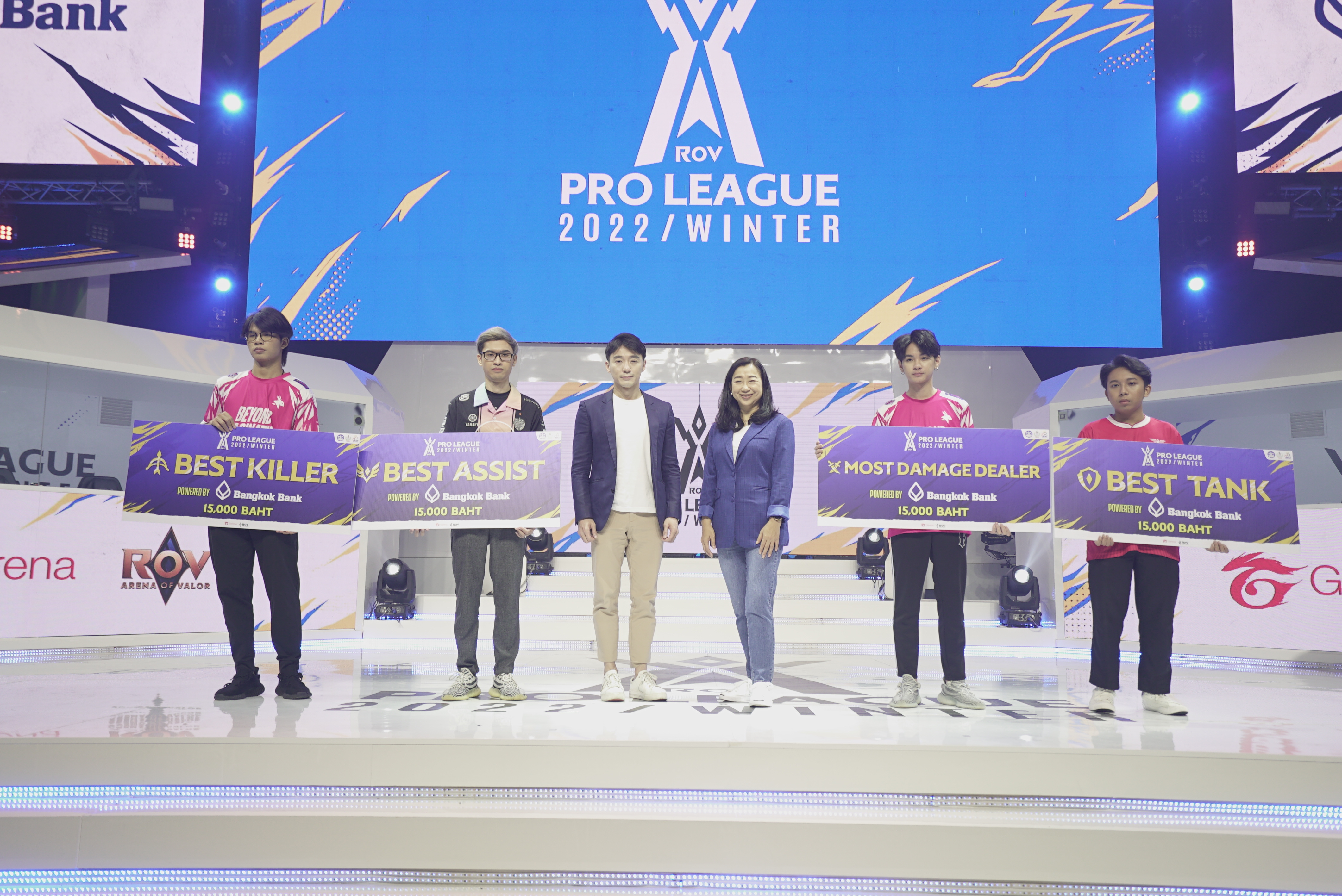 10 ตุลาคม 2565 : นิรมาณ ไหลสาธิต รองผู้จัดการใหญ่ ธนาคารกรุงเทพ จำกัด (มหาชน) ในฐานะผู้สนับสนุนหลักการแข่งขันกีฬาลีกอาชีพเกม RoV ในประเทศไทย ‘RoV Pro League 2022 Winter’ มอบรางวัลนักแข่งยอดเยี่ยม จำนวน 4 รางวัล แก่ EA Kaito (Best Killer), BRU KSSA (Best Assist), KOG Cinderella (Best Tank), และ EA Gabrielz (Most Damage Dealer) พร้อมร่วมชื่นชมและแสดงความยินดีกับผู้ที่ได้รับรางวัลและผู้เข้าร่วมแข่งขันในครั้งนี้ ปลื้ม! กระแสตอบรับโปรโมชันเอาใจเหล่าสาวก RoV ล้นหลาม ดันยอดทะลุเป้า ลูกค้าใหม่เปิดใช้บริการโมบายแบงก์กิ้ง จากธนาคารกรุงเทพ