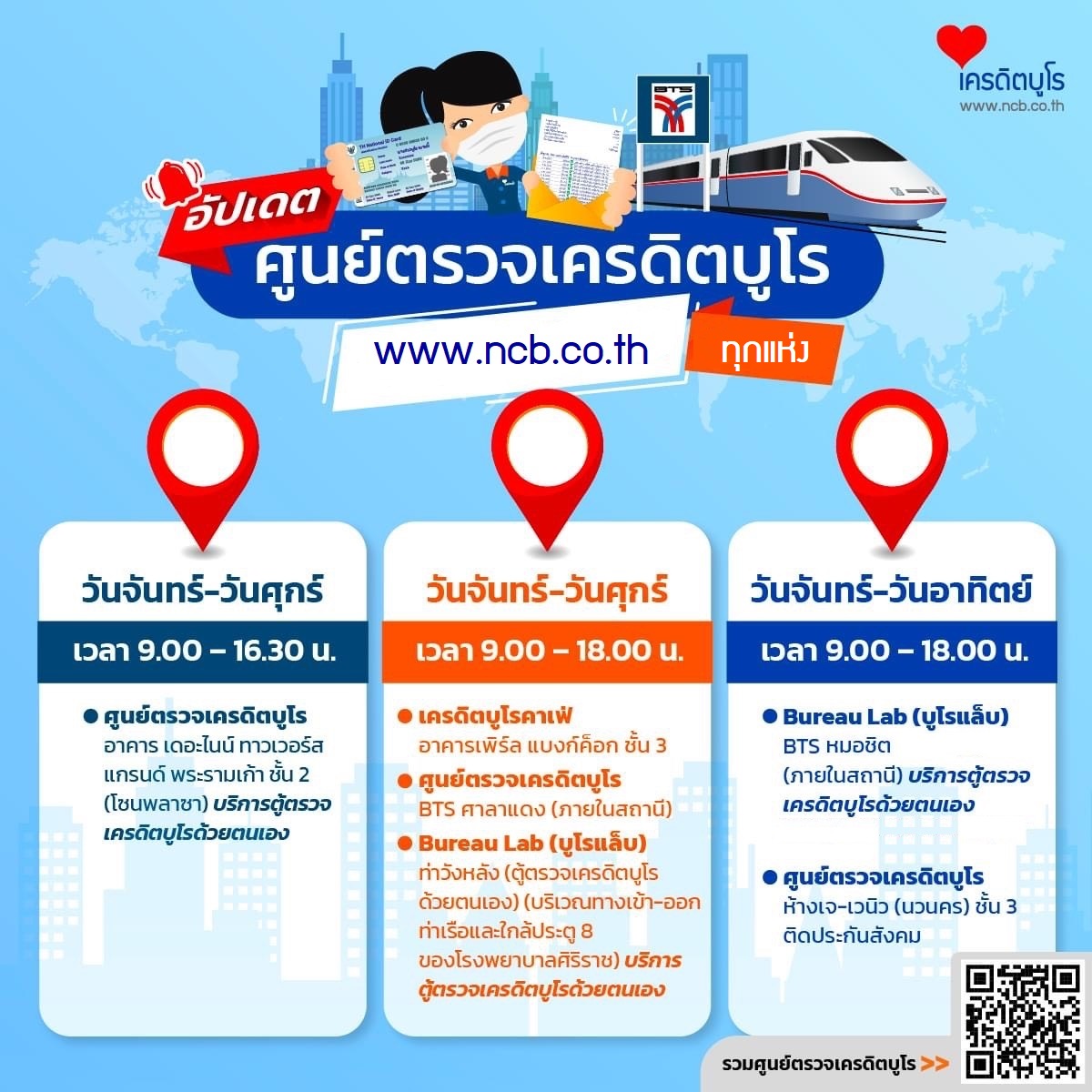ลิงก์รวมศูนย์ตรวจเครดิตบูโรทุกแห่งในกรุงเทพฯ และปริมณฑล https://www.ncb.co.th/contact โดยก่อนเดินทางไปศูนย์ตรวจเครดิตบูโร กรุณาตรวจสอบวันและเวลาให้บริการผ่านเฟซบุ๊กและ Line Official “@ilovebureau”