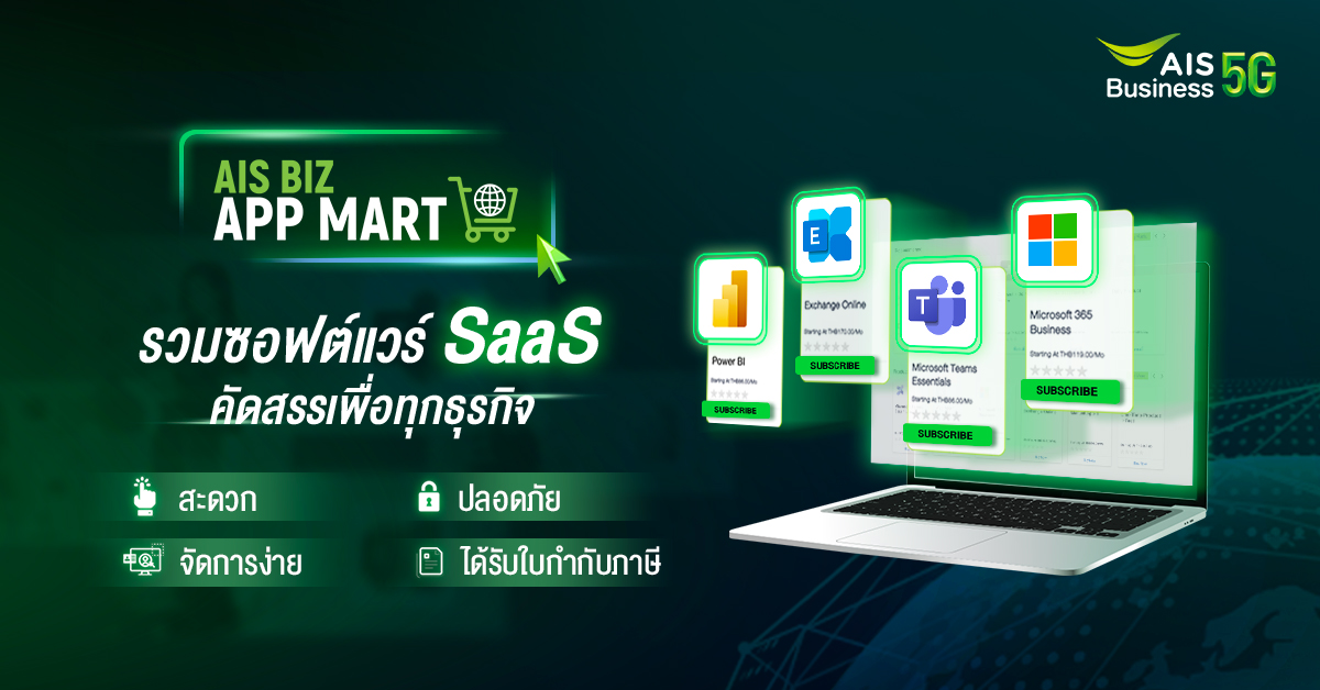 ล่าสุดเปิดตัว “AIS Biz App Mart สุดยอดมาร์เก็ตเพลสศูนย์รวมซอฟต์แวร์เพื่อธุรกิจ รายแรกในไทย” (Software as a service marketplace) ให้ภาคธุรกิจสามารถบริหารจัดการดิจิทัลโซลูชันและซอฟต์แวร์ได้ง่าย ครบ จบในที่เดียวด้วยตัวเองตลอด 24 ชั่วโมง