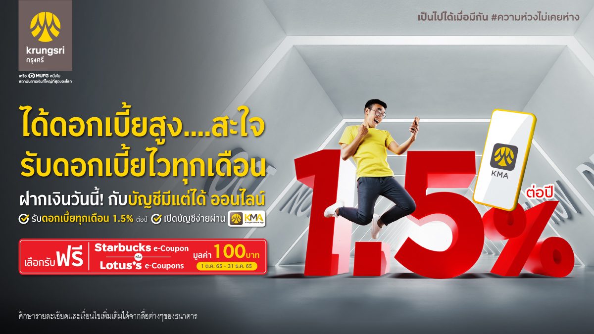 กรุงเทพฯ, 1 พฤศจิกายน 2565 : กรุงศรี (ธนาคารกรุงศรีอยุธยา จำกัด (มหาชน)) ในเครือของมิตซูบิชิ ยูเอฟเจ ไฟแนนเชียล กรุ๊ป (MUFG) หนึ่งในกลุ่มสถาบันการเงินที่ใหญ่ที่สุดระดับโลก เสนอทางเลือกในการออมเงินที่ให้มากกว่าทั้งผลประโยชน์ ความรวดเร็ว ความสะดวกสบายไม่ต้องเดินทางไปที่สาขา กับแคมเปญ “ได้ดอกเบี้ยสูง…สะใจ รับดอกเบี้ยไวทุกเดือน กับบัญชีมีแต่ได้ ออนไลน์” ที่ให้ดอกเบี้ยสูงสุดถึง 1.5% ต่อปี เพียงเปิดบัญชีผ่านทาง KMA – Krungsri Mobile Application และมียอดทำธุรกรรมขั้นต่ำ 200 บาทขึ้นไป พร้อมเลือกรับฟรี Starbucks e-Coupon หรือ Lotus’s e-Coupons มูลค่า 100 บาท* อย่ารอช้า มาเริ่มต้นออมเงินพร้อมข้อเสนอดีๆ ตั้งแต่วันนี้ – 31 ธันวาคม 2565