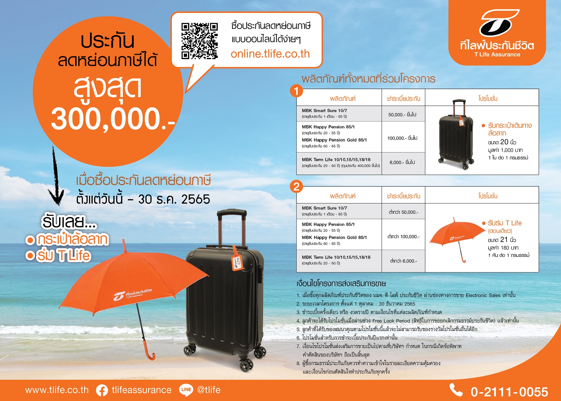 ช่องทางที่ 2 Electronic Sales ซื้อแบบประกัน online รับฟรี! กระเป๋าเดินทางแบบล้อลากขนาด 20 นิ้ว หรือรับร่ม T Life ขนาด 21 นิ้ว เมื่อซื้อกรมธรรม์ตามที่บริษัทฯ กำหนด โดยลูกค้าที่ซื้อแบบประกันของบริษัทฯ ทั้ง 2 ช่องทางสามารถใช้สิทธิ์ลดหย่อนภาษีได้สูงสุด 300,000 บาท ตามที่กรมสรรพากรกำหนดด้วย