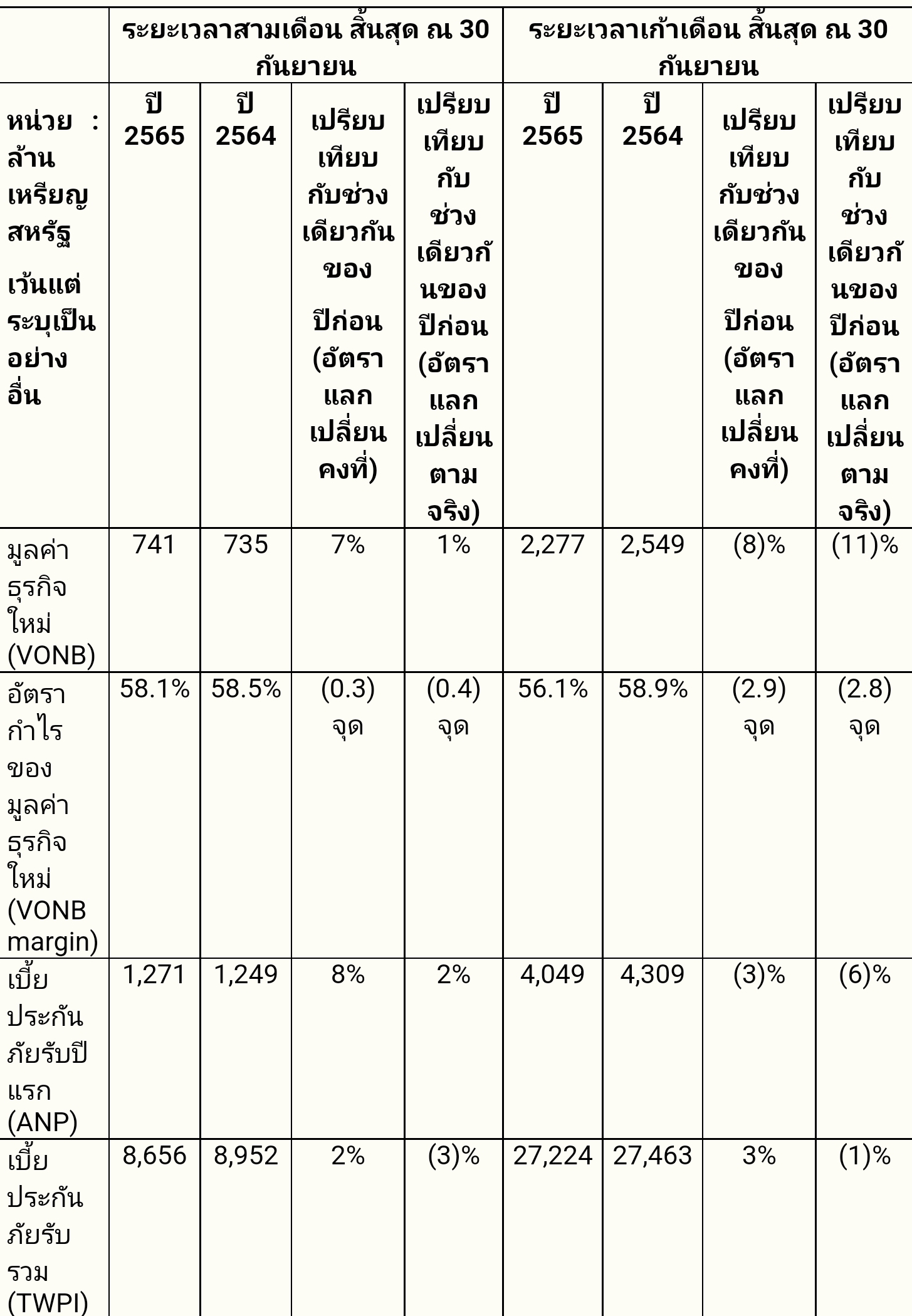 โดยภาพรวมเบี้ยประกันภัยรับปีแรก (ANP) ของกลุ่มบริษัทเพิ่มขึ้นร้อยละ 8 หรือเพิ่มเป็น 1,271 ล้านเหรียญสหรัฐ กำไรจากมูลค่าธุรกิจใหม่ยังคงทรงตัวในวงกว้างจากปีที่แล้วที่ร้อยละ 58.1 สำหรับสมมติฐานผลตอบแทนจากการลงทุนระยะยาวที่ใช้ในการคำนวณมูลค่าธุรกิจใหม่ยังคงไม่เปลี่ยนแปลงจากที่แสดงในรายงานประจำปี 2564 ของเรา กำไรที่รายงานเป็นมูลค่าปัจจุบันของเบี้ยประกันภัยธุรกิจใหม่ (PVNBP) เพิ่มขึ้นเป็นร้อยละ 10 จากร้อยละ 9 ในไตรมาสที่สามของปี 2564 ขณะที่เบี้ยประกันภัยรับรวม (TWPI) เพิ่มขึ้นร้อยละ 2 เป็น 8,656 ล้านเหรียญสหรัฐในช่วงเวลาเดียวกัน
