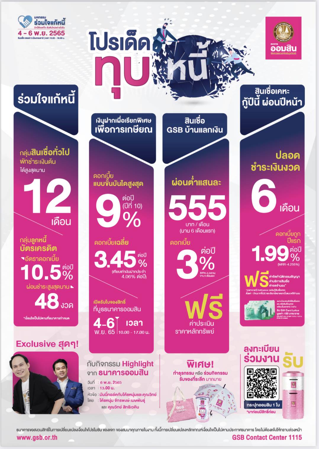 ทั้งนี้ ขอเชิญชวนลูกค้าประชาชนเยี่ยมชมและร่วมกิจกรรมที่บูธธนาคารออมสินได้ ภายในงานมหกรรมร่วมใจแก้หนี้ สัญจร ซึ่งนอกจากโปรดักส์ ไฮไลท์ข้างต้นแล้ว ยังมีสินเชื่อ GSB บ้านแลกเงิน และ สินเชื่อเคหะ “กู้ปีนี้ ผ่อนปีหน้า” รวมถึงการจัดฝึกอบรมอาชีพ การแสดงและจำหน่ายสินค้าของผู้ประกอบการรายย่อยในโครงการพัฒนาของธนาคารออมสิน และร่วมรับฟังความรู้จากผู้เชี่ยวชาญการวางแผนออมเงินในช่วง Money Talk กับโค้ชหนุ่ม-จักรพงษ์ เมษพันธุ์ พิเศษลงทะเบียนล่วงหน้าก่อนเข้าร่วมงานที่เว็บ https://ln15.gsb.or.th/WEB-DEBT/ จะได้รับกระปุกออมสินเป็นที่ระลึก ![]()