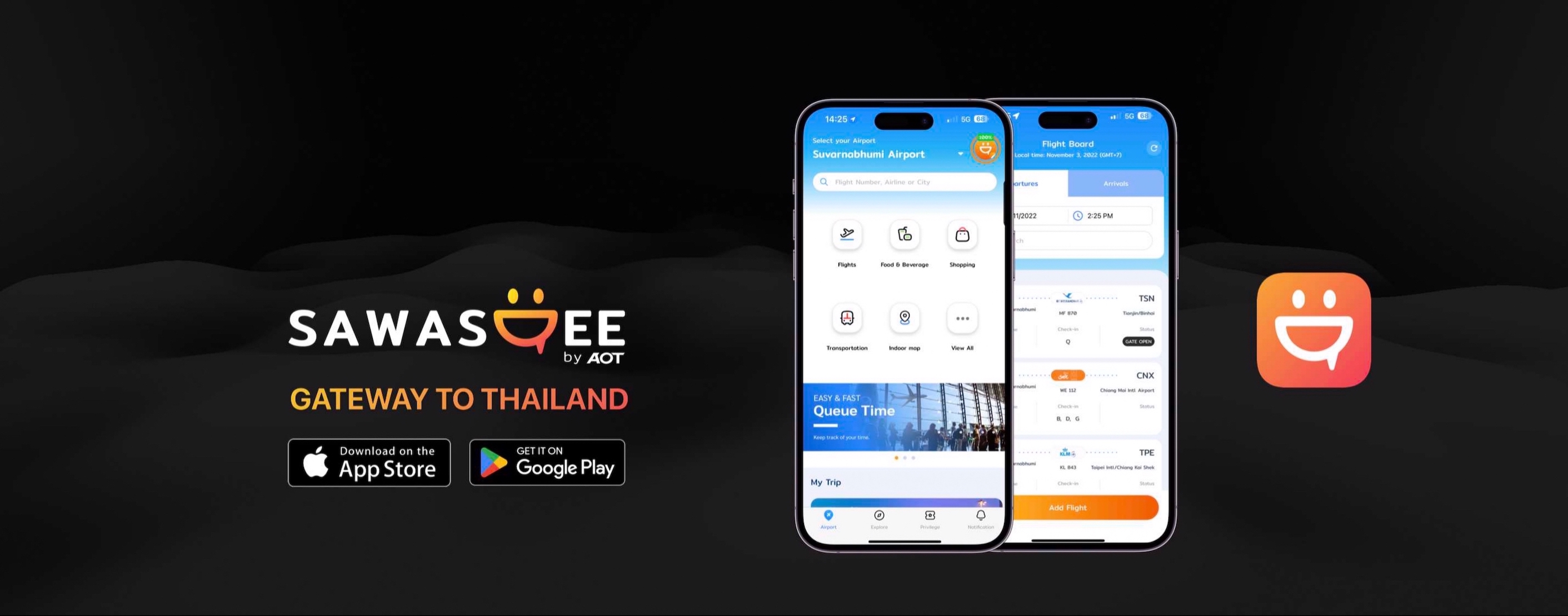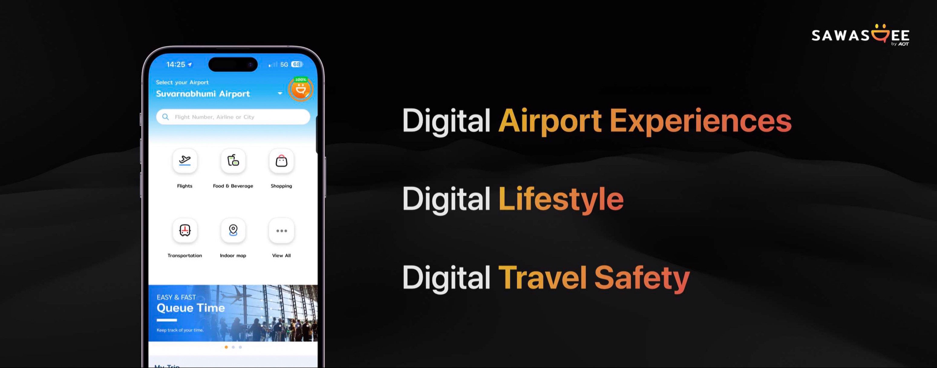 2.Digital Lifestyle ยกระดับบริการด้านการใช้จ่ายและสิทธิพิเศษ 3.Digital Travel Safety ยกระดับความปลอดภัยและอำนวยความสะดวกด้านการท่องเที่ยว ทั้งนี้ แอปพลิเคชัน SAWASDEE by AOT มีฟีเจอร์ที่โดดเด่น ทั้ง “Flights” เชื่อมต่อข้อมูล Flight Board จากสนามบิน ค้นหาเที่ยวบินทั้งขาเข้า-ขาออก สามารถบันทึกไฟลท์บินล่วงหน้าก่อนการเดินทาง พร้อมแจ้งเตือนหากมีการเปลี่ยนแปลงของเที่ยวบิน “Queue Time” แสดงข้อมูลเวลารอคิวในทั้ง 3 โซนภายในสนามบิน ได้แก่ จุดเช็คอิน จุดตรวจค้นเพื่อการรักษาความปลอดภัย และจุดตรวจหนังสือเดินทาง