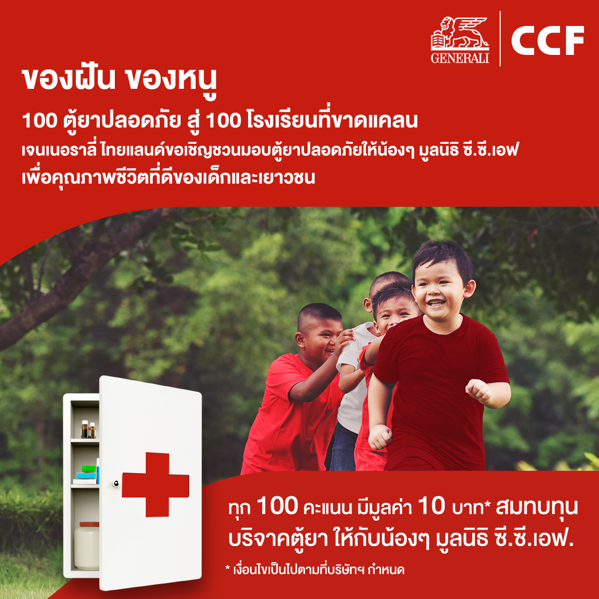 11 พฤศจิกายน 2565 : เจนเนอราลี่ ไทยแลนด์ ชวนลูกค้าเจนเนอราลี่ ทั่วประเทศ ร่วมเป็นส่วนหนึ่งในโครงการ “ของฝัน ของหนู” เปลี่ยนคะแนนสะสมในแอปพลิเคชัน GEN365 เป็นการบริจาคโดยร่วมสมทบทุนเพื่อจัดซื้อ 100 ตู้ยาที่ปลอดภัย สู่ 100 โรงเรียนที่ขาดแคลน กับมูลนิธิ ซี.ซี.เอฟ (Community Children Foundation) สำหรับจัดซื้อตู้ยาและยาสามัญ รวมถึงเวชภัณฑ์ที่จำเป็นให้แก่น้องๆ เยาวชนในเขตพื้นที่ห่างไกลได้ใช้สำหรับการปฐมพยาบาลเบื้องต้น เพื่อเป็นส่วนหนึ่งในการดูแลรักษา และ เพื่อสร้างคุณภาพชีวิตที่ดียิ่งขึ้น