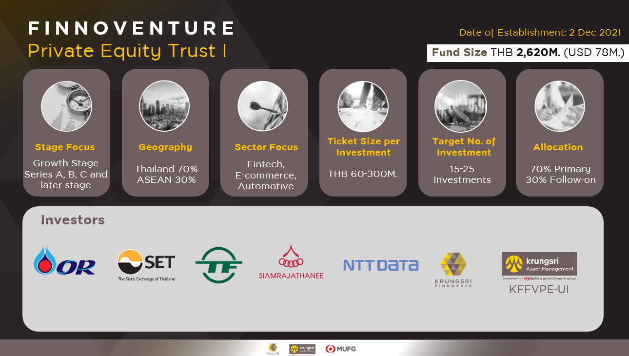 · บริษัทฯ ได้ตั้ง Finnoventure Private Equity Trust 1 กองทุนมูลค่า 3,000 ล้านบาท กองแรกในไทยที่มุ่งลงทุนในสตาร์ทอัพและเปิดให้นักลงทุนรายบุคคล (UI) ได้ร่วมลงทุน