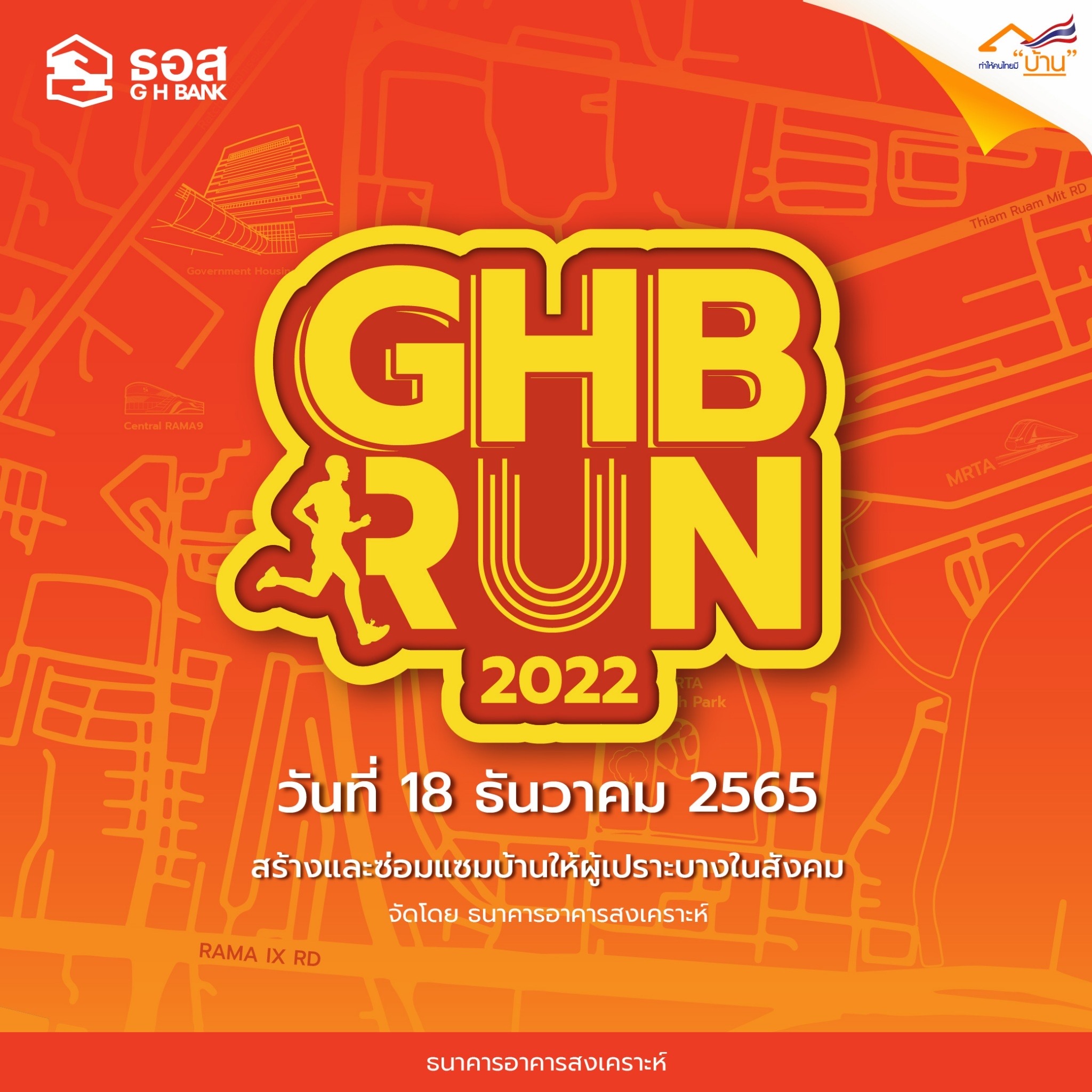 16 พฤศจิกายน 2565 : นายฉัตรชัย ศิริไล กรรมการผู้จัดการธนาคารอาคารสงเคราะห์ (ธอส.) เปิดเผยว่า เพื่อเป็นการส่งเสริมให้คนไทยหันมาออกกำลังกายเพื่อสุขภาพที่ดี พร้อมกับได้มีส่วนร่วมในการสร้างความมั่นคงทางด้านที่อยู่อาศัยให้กับกลุ่มผู้เปราะบางในสังคมไทย เพื่อคุณภาพชีวิตที่ดียิ่งขึ้น ธอส. สถาบันการเงินเฉพาะกิจของรัฐที่มีพันธกิจ “ทำให้คนไทยมีบ้าน” จึงได้จัดกิจกรรมเดิน-วิ่ง “GHB RUN 2022” ในวันอาทิตย์ที่ 18 ธันวาคม 2565 ชิงเงินรางวัลมูลค่ารวมสูงถึง 340,000 บาท