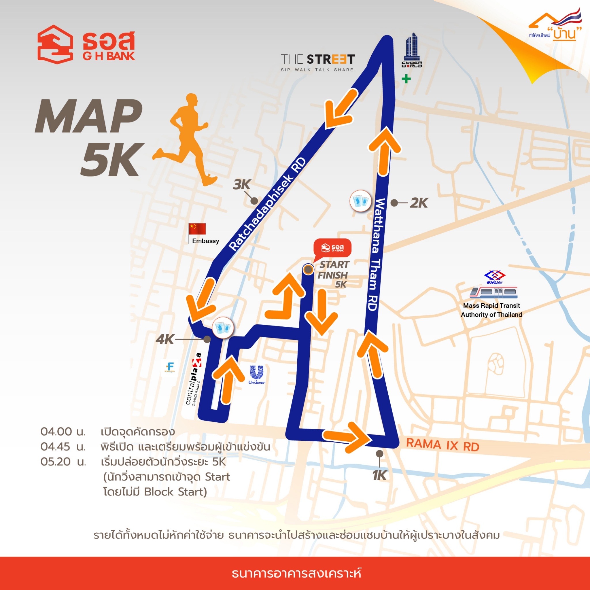 ทั้งนี้ กิจกรรมดังกล่าวจะจัดขึ้นในวันอาทิตย์ที่ 18 ธันวาคม 2565 ตั้งแต่เวลา 4.00-8.30 น. โดยมีจุด Start และ Finish ที่ธนาคารอาคารสงเคราะห์ สำนักงานใหญ่ พระราม 9 ซึ่งผู้เข้าร่วมงานสามารถจอดรถได้ฟรีที่อาคารจอดรถ Central Rama 9 (ถนนรัชดาภิเษก) รองรับรถได้จำนวน 1,500 คัน 2.ลานจอดรถ อาคาร G-Tower (ถนนพระราม 9) รองรับจำนวน 500 คัน