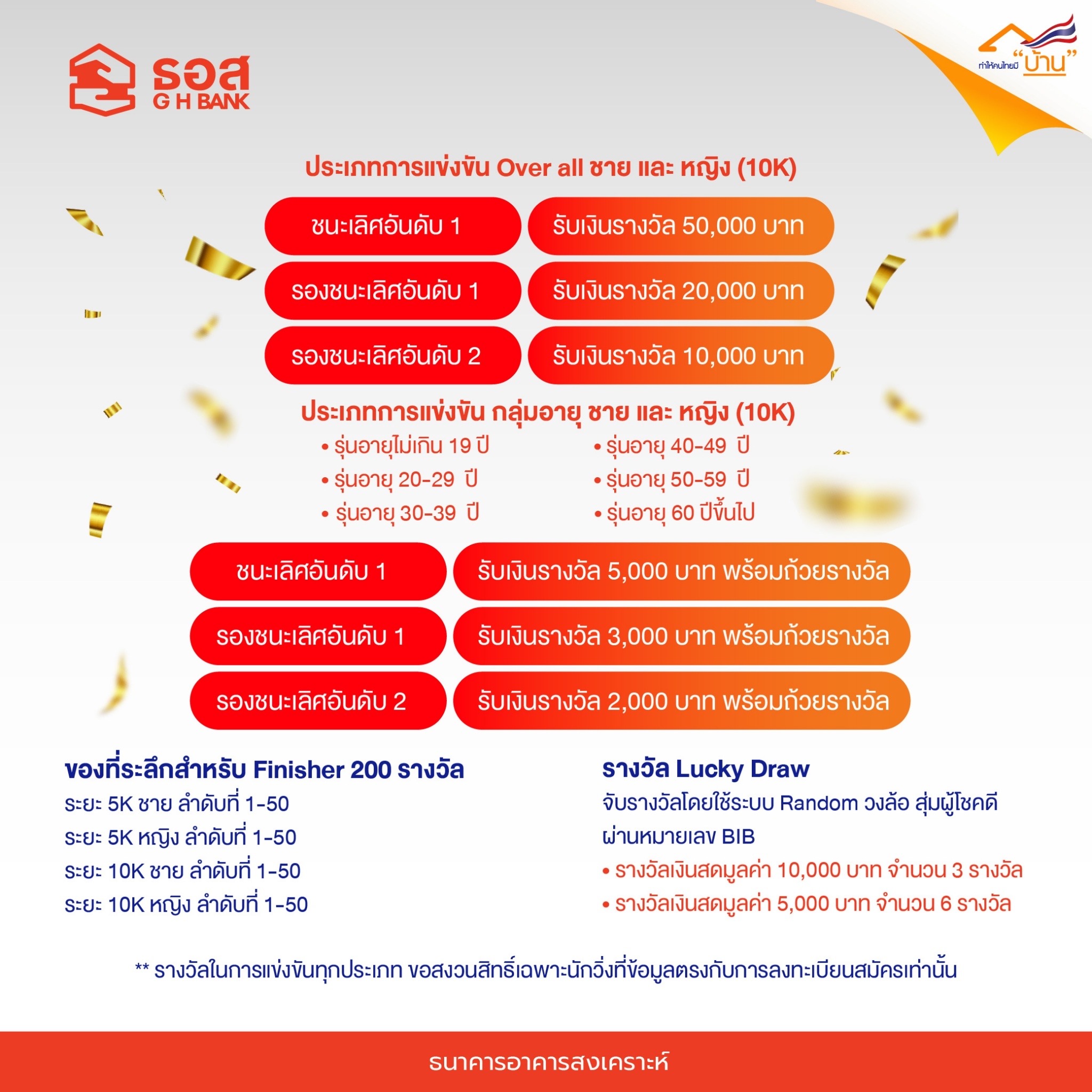 นอกจากนี้ ธนาคารจะนำรายได้จากค่าสมัครของผู้เข้าร่วมกิจกรรมทั้งหมดโดยไม่หักค่าใช้จ่ายรายละ 400 บาท ไปสร้างและซ่อมแซมที่อยู่อาศัยให้กับกลุ่มผู้เปราะบางในสังคม ได้อยู่อาศัยภายในบ้านที่มีคุณภาพและสภาพแวดล้อมเหมาะสมกับการดำเนินชีวิตมากยิ่งขึ้น โดยแบ่งระยะการวิ่งเป็น 2 ประเภท คือ ประเภท Fun run ระยะ 5 กิโลเมตร และ Mini marathon ระยะ 10 กิโลเมตร ขณะที่การแข่งขันและเงินรางวัลประเภท Mini Marathon แบ่งออกเป็น 2 ประเภทรางวัล ประกอบด้วย