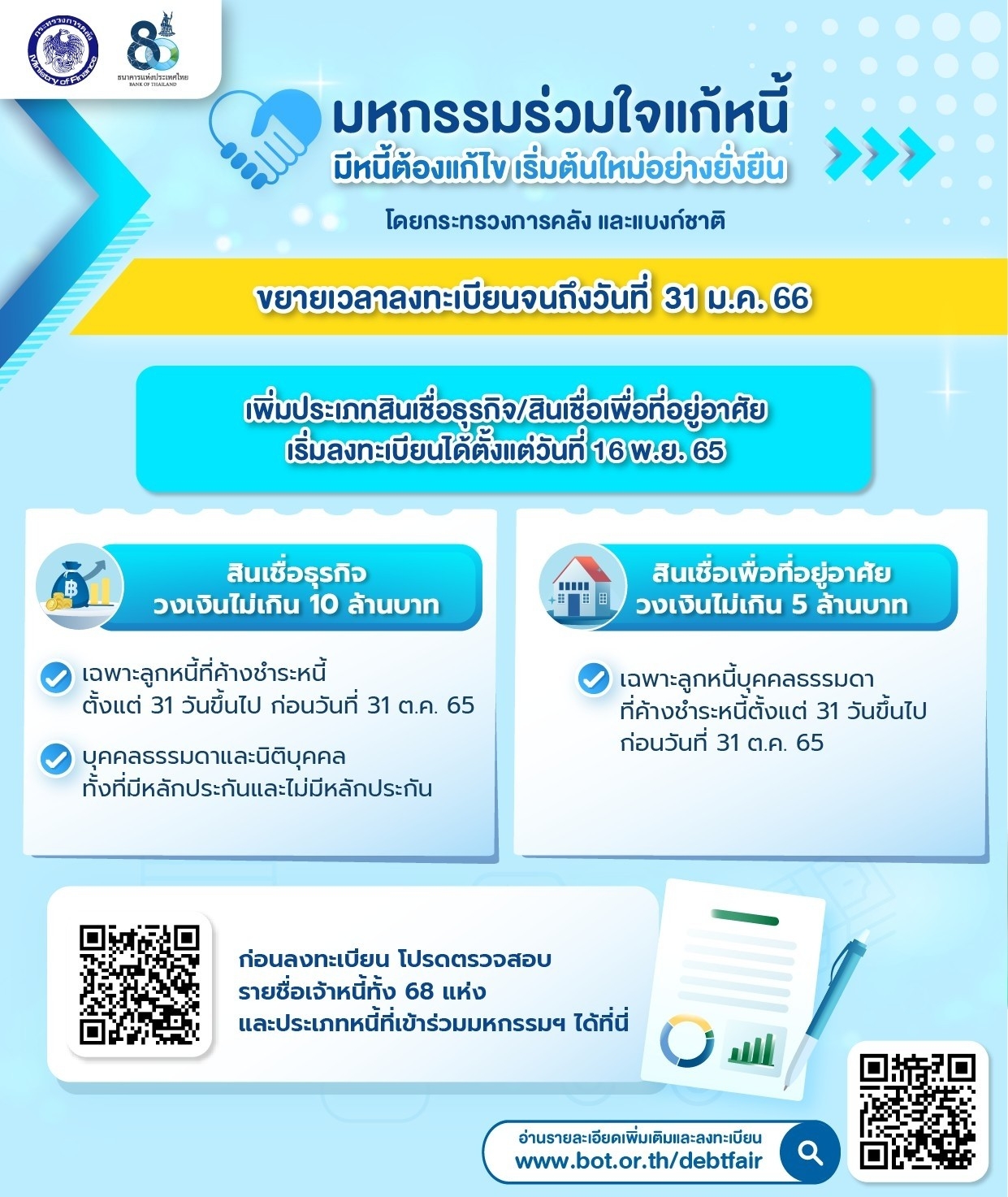16 พฤศจิกายน 2565 : ตามที่กระทรวงการคลังและ ธปท. ได้ร่วมกันจัดมหกรรมร่วมใจแก้หนี้ เพื่อช่วยเหลือประชาชนให้ได้รับการปรับโครงสร้างหนี้หรือปรับค่างวดให้สอดคล้องกับความสามารถในการชำระหนี้ รวมทั้งเพื่ออำนวยความสะดวกให้ลูกหนี้สามารถลงทะเบียนออนไลน์ได้ในที่เดียวแต่เจรจากับเจ้าหนี้ทั้งหลายได้ในช่วงเวลาของงานมหกรรม
