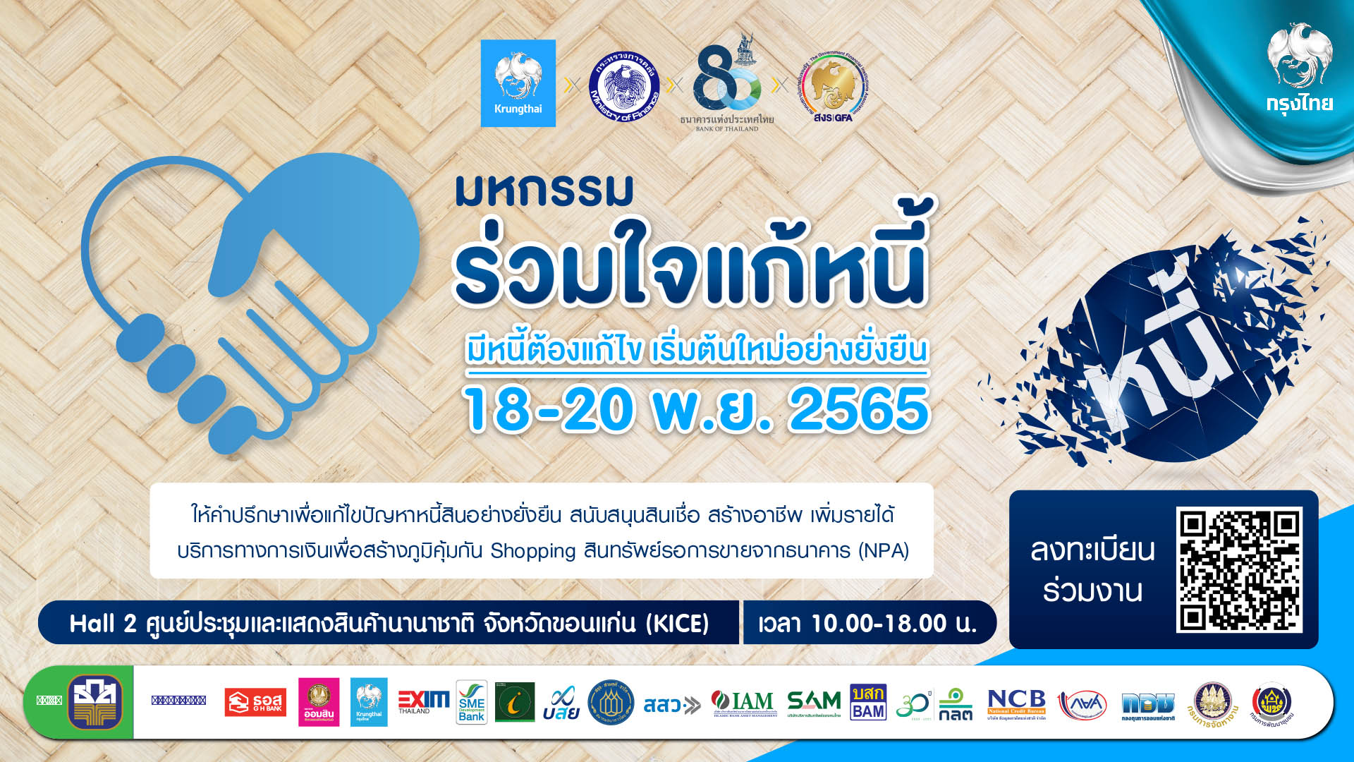 17 พฤศจิกายน 2565 : ธนาคารกรุงไทย ในฐานะธนาคารพาณิชย์ของรัฐ สนับสนุนการแก้ไขปัญหาหนี้ครัวเรือนของประเทศ เพื่อขับเคลื่อนเศรษฐกิจไทยให้ฟื้นตัวได้อย่างยั่งยืน เข้าร่วมงาน “มหกรรมร่วมใจแก้หนี้สัญจร : มีหนี้ต้องแก้ไข เริ่มต้นใหม่อย่างยั่งยืน” ครั้งที่ 2 ระหว่างวันที่ 18 – 20 พฤศจิกายน 2565 ณ ศูนย์ประชุมและแสดงสินค้านานาชาติขอนแก่น จังหวัดขอนแก่น ภายใต้แนวคิด “ติดปีกการเงินไทย สู่ความยั่งยืน” โดยนำเสนอมาตรการแก้ไขปัญหาหนี้สินอย่างครบวงจร ทั้งการปรับลดอัตราดอกเบี้ย ลดค่างวดการผ่อนชำระ ขยายระยะเวลาผ่อนชำระ รวมถึงการเสริมสภาพคล่องให้กับลูกค้า ครอบคลุมทั้งลูกค้าบุคคลและลูกค้าธุรกิจ ดังนี้