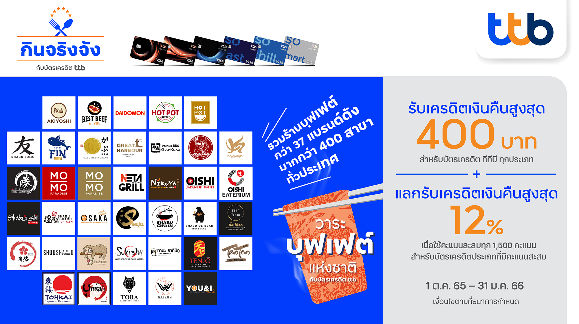 18 พฤศจิกายน 2565 : บัตรเครดิต ทีทีบี มอบสิทธิพิเศษสำหรับผู้ถือบัตรเครดิต ทีทีบี ทุกประเภท จัดรายการ “วาระบุฟเฟต์แห่งชาติ” จับมือร้านอาหารบุฟเฟต์ชื่อดังกว่า 37 แห่ง มอบเครดิตเงินคืนสูงสุด 400 บาท และแลกคะแนนรับเครดิตเงินคืนสูงสุด 12% ตั้งแต่วันนี้ ถึง 31 มกราคม 2566 ดังนี้