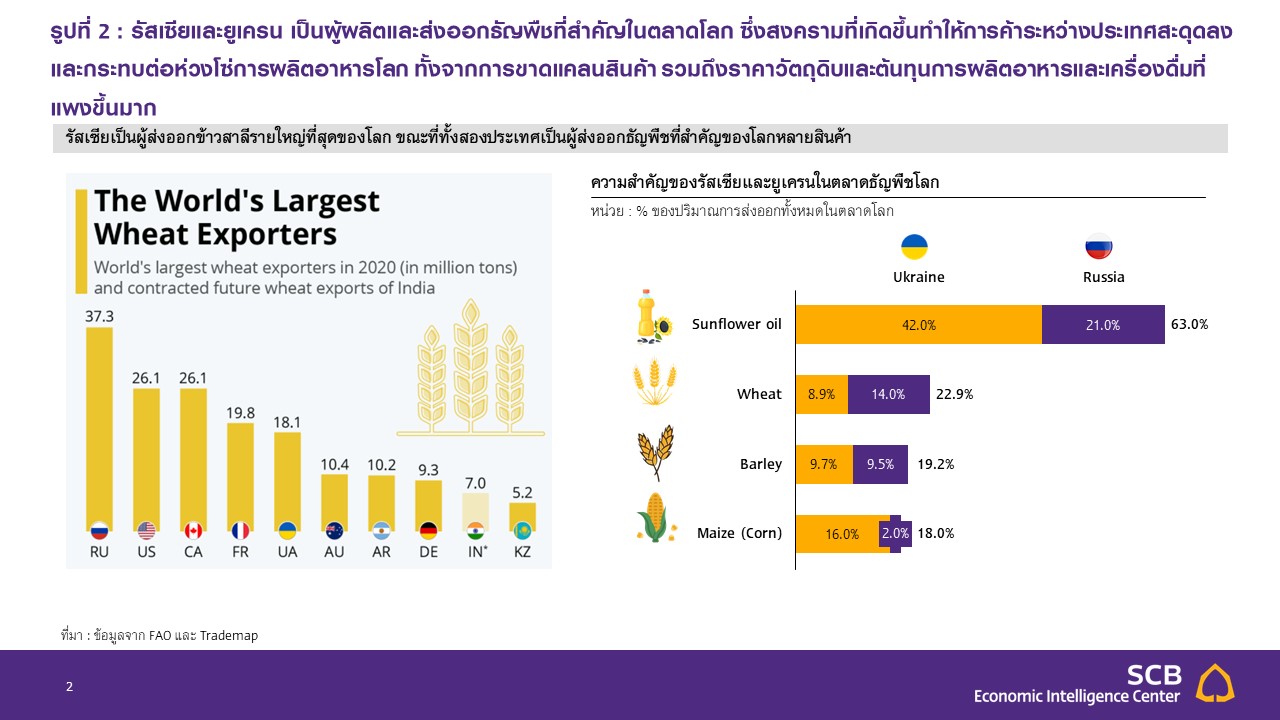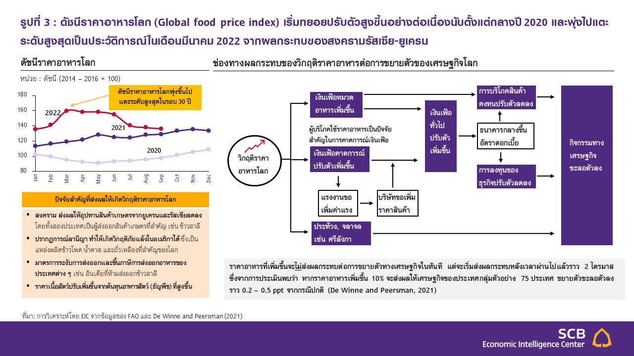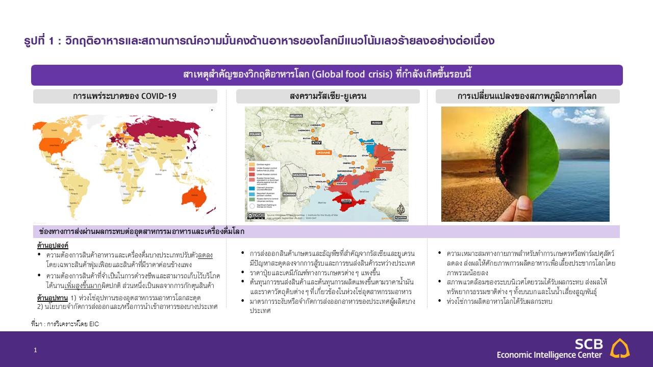 2) สงครามรัสเซีย-ยูเครน และ 3) การเปลี่ยนแปลงของสภาพภูมิอากาศโลก ซึ่งปัจจัยดังกล่าวเหล่านี้ได้ส่งผลให้เกิดการเปลี่ยนแปลงทั้งด้านอุปทานและอุปสงค์ ในตลาดอาหารโลกในวงกว้างอย่างมีนัยสำคัญ อีกทั้งยังส่งผลกระทบต่อห่วงโซ่การผลิตอาหารโลกตั้งแต่ระดับต้นน้ำจนถึงปลายน้ำ