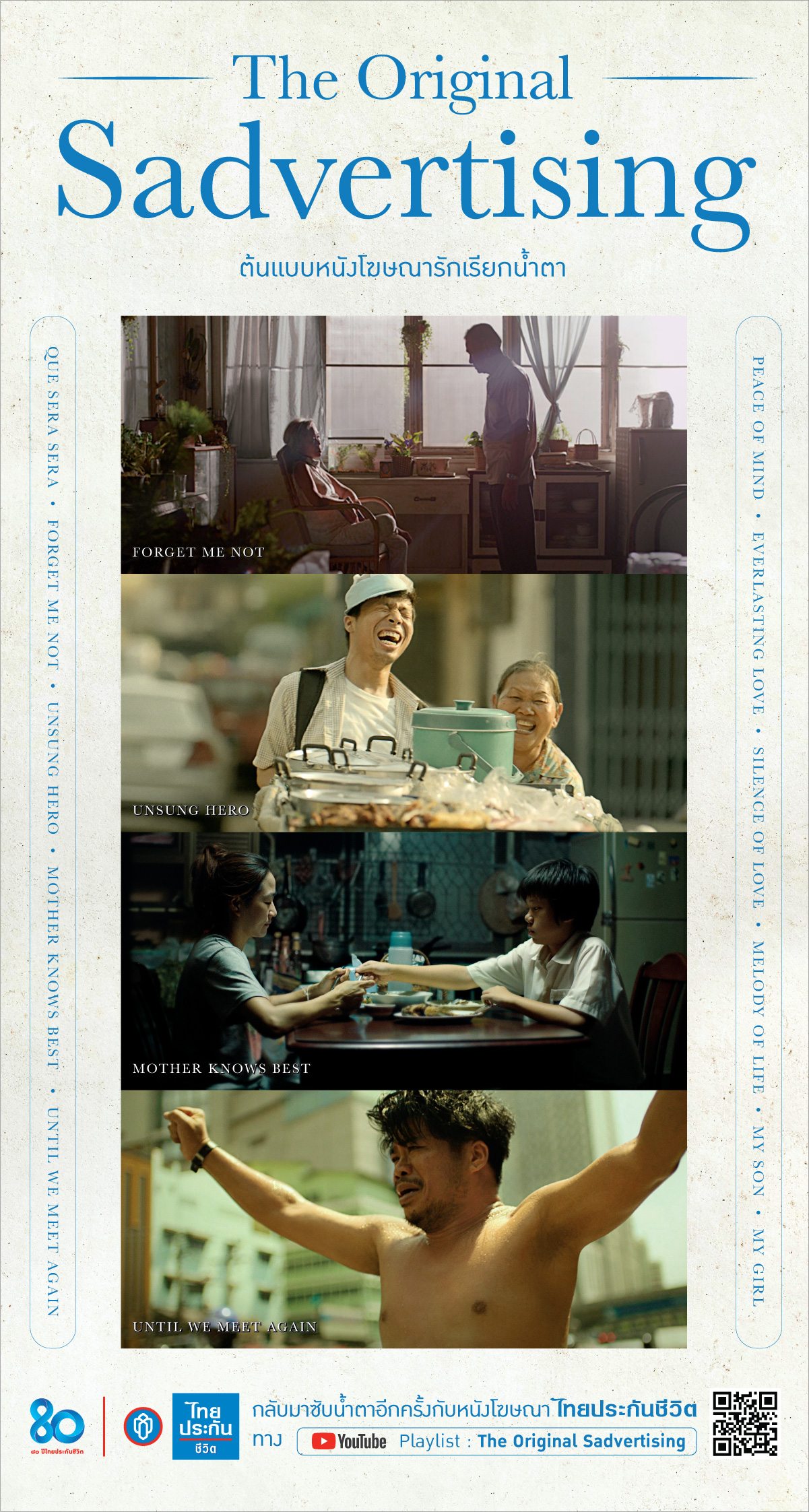 ในวาระครบรอบ 80 ปี ไทยประกันชีวิต บริษัทฯ จึงเปิดตัวแคมเปญ “80 ปี The Original Sadvertising” โดยรวบรวมภาพยนตร์โฆษณารักที่เป็นเอกลักษณ์ของบริษัทฯ ที่เคยสร้างความประทับใจให้แก่ผู้ชม และหลายเรื่องกลายเป็น Talk of the Town นำกลับมาให้รับชมอีกครั้ง เพื่อให้ผู้ที่เคยรับชม รวมถึงผู้ที่อาจไม่เคยได้ชมภาพยนต์โฆษณาของไทยประกันชีวิต ได้ร่วมซาบซึ้งกับเรื่องราวความรักที่ไม่มีวันหมดอายุ และร่วมสัมผัสคุณค่าแห่งความรักในหลากหลายรูปแบบ