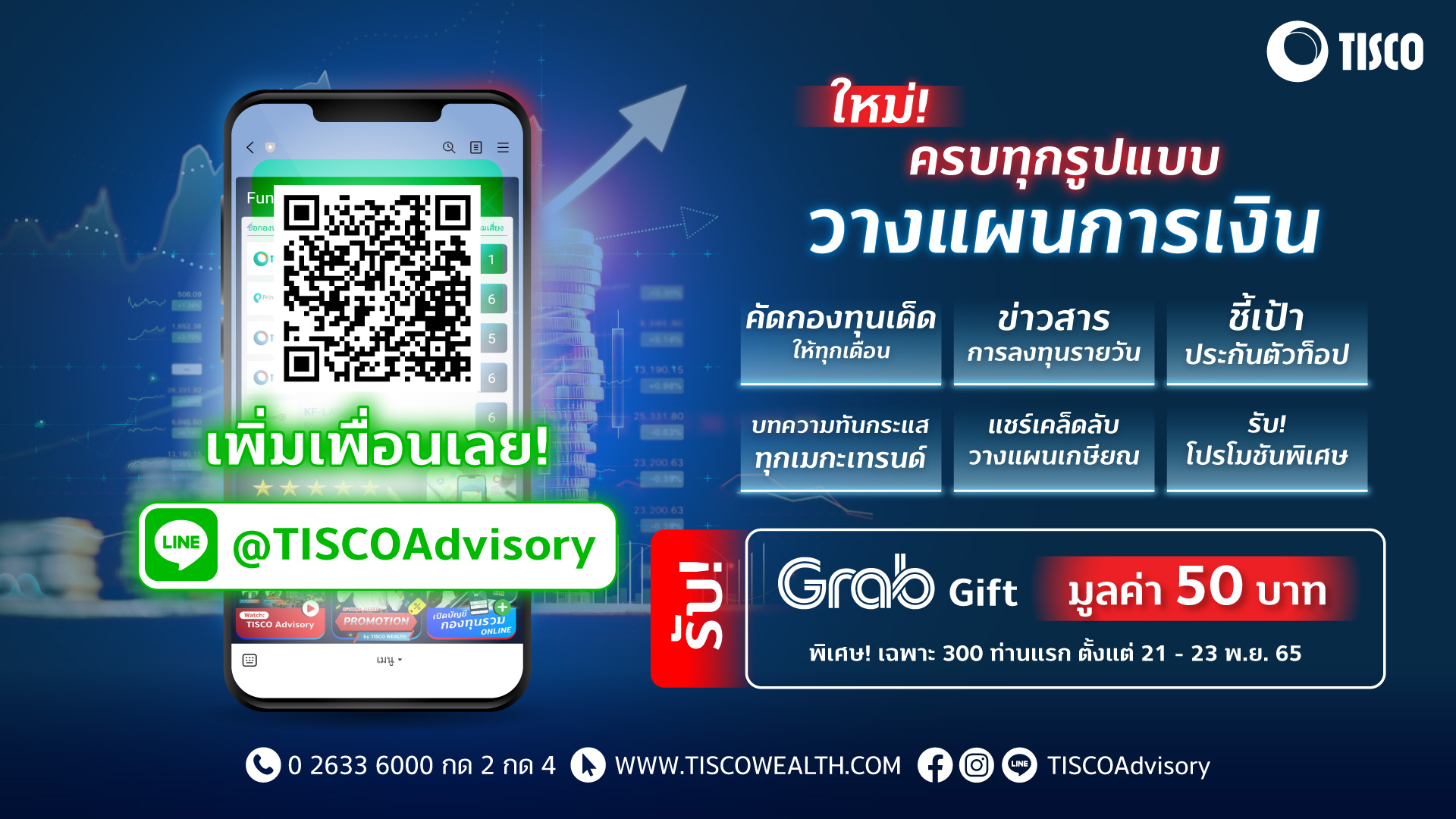 และ พิเศษ! เฉพาะ 500 ท่านแรกที่ Add Line @TISCOAdvisory ตั้งแต่วันที่ 21 – 23 พฤศจิกายน 2565 รับ Grab Gift มูลค่า 50 บาท เพิ่มเพื่อนคลิก https://line.me/R/ti/p/%40506vyhte ![]()
