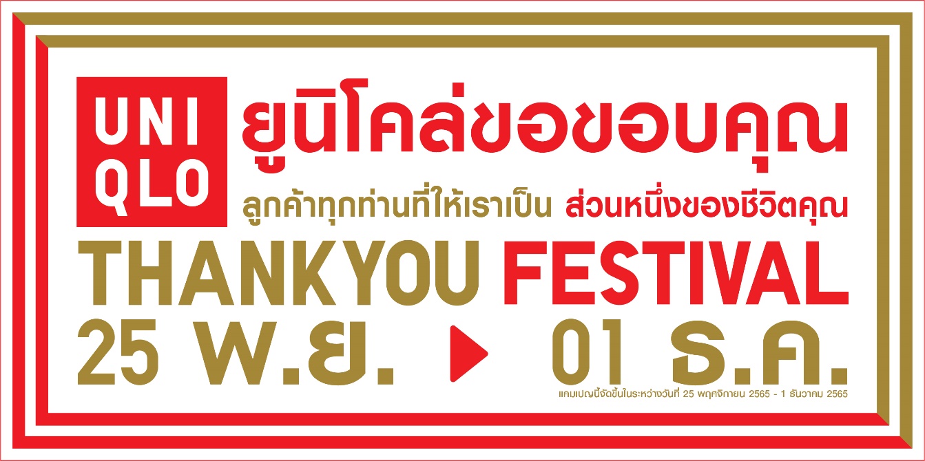 พลาดไม่ได้กับ THANK YOU FESTIVAL เทศกาลขอบคุณส่งท้ายปีจากยูนิโคล่ ตั้งแต่วันที่ 25 พฤศจิกายน –1 ธันวาคม 2565 เท่านั้น ที่ร้านยูนิโคล่ทุกสาขาและยูนิโคล่ ออนไลน์สโตร์ที่ www.uniqlo.com/th