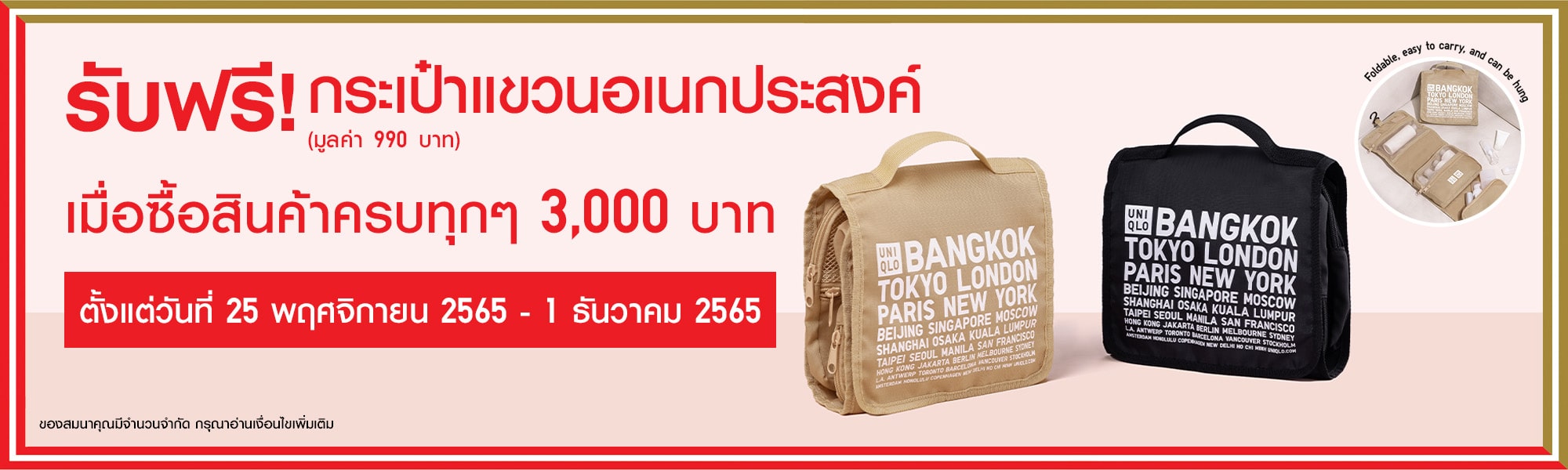 รับฟรี! กระเป๋าแขวนอเนกประสงค์ สีดำ หรือสีเบจ 1 ใบ เมื่อช้อปครบ 3,000 บาท ต่อ 1 ใบเสร็จ ในระหว่างวันที่ 25 พฤศจิกายน – 1 ธันวาคม 2565 ที่ร้านยูนิโคล่และออนไลน์สโตร์