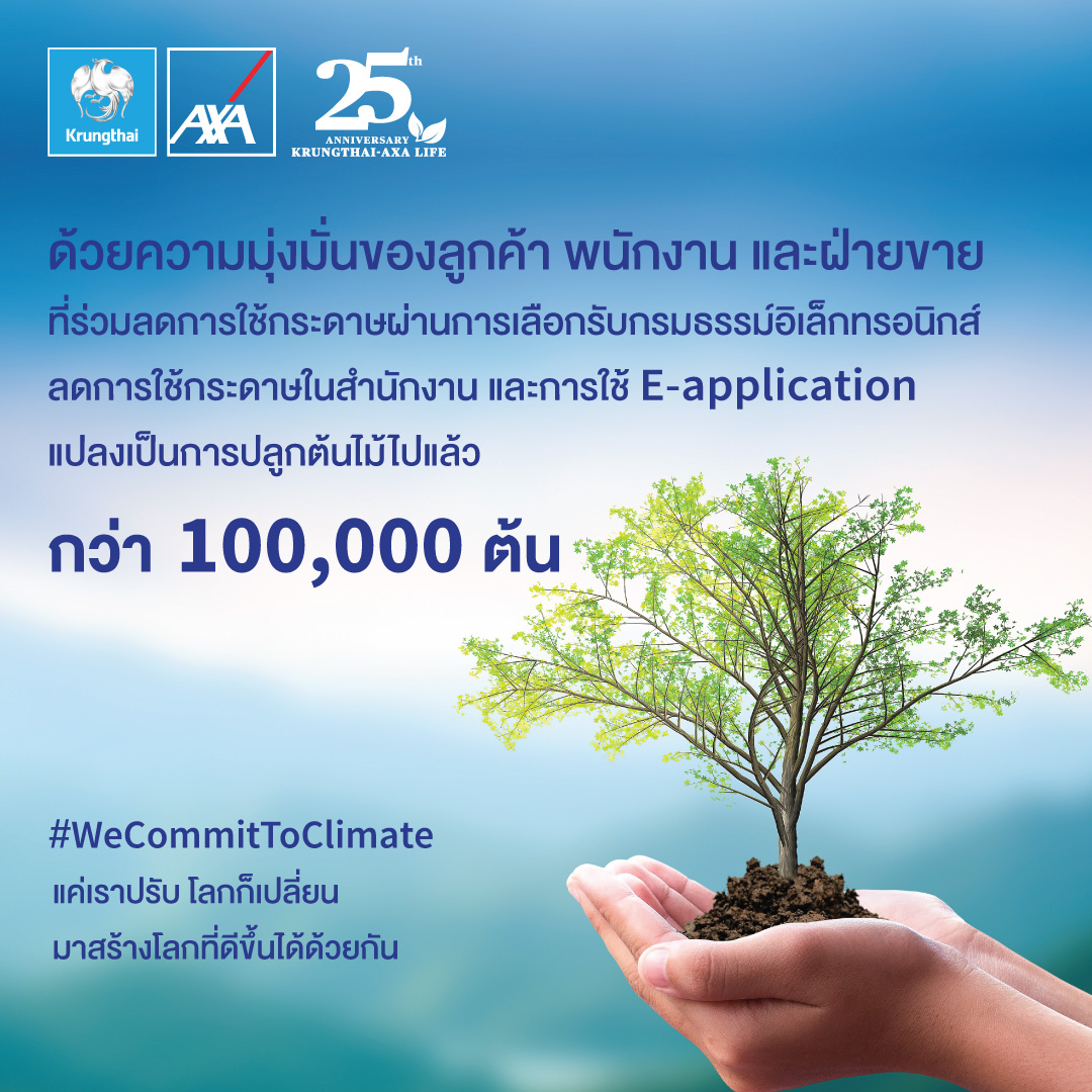 สำหรับฝ่ายขาย ได้เปลี่ยนจากแบบฟอร์มการสมัครประกันแบบกระดาษ เป็นเล็กโทรนิกส์ (E-application) ซึ่งทุก 10 E-application จะเปลี่ยนเป็นการปลูกต้นไม้ 1 ต้น และสุดท้ายสำหรับลูกค้า ที่เลือกรับกรมธรรม์อิเล็กทรอนิกส์ (E-policy) แทนกรมธรรม์กระดาษ ทุก 1 กรมธรรม์จะแปลงเป็นการปลูกต้นไม้ 1 ต้น ซึ่งกิจกรรมดังกล่าวสอดคล้องกับนโยบายของบริษัทฯ ที่มุ่งมั่นอยู่เคียงข้าง คุ้มครอง พร้อมใส่ใจ สิ่งแวดล้อม #WeCommitToClimate แค่เราปรับ โลกก็เปลี่ยน มาสร้างโลกที่ดีขึ้นไปด้วยกัน ![]()