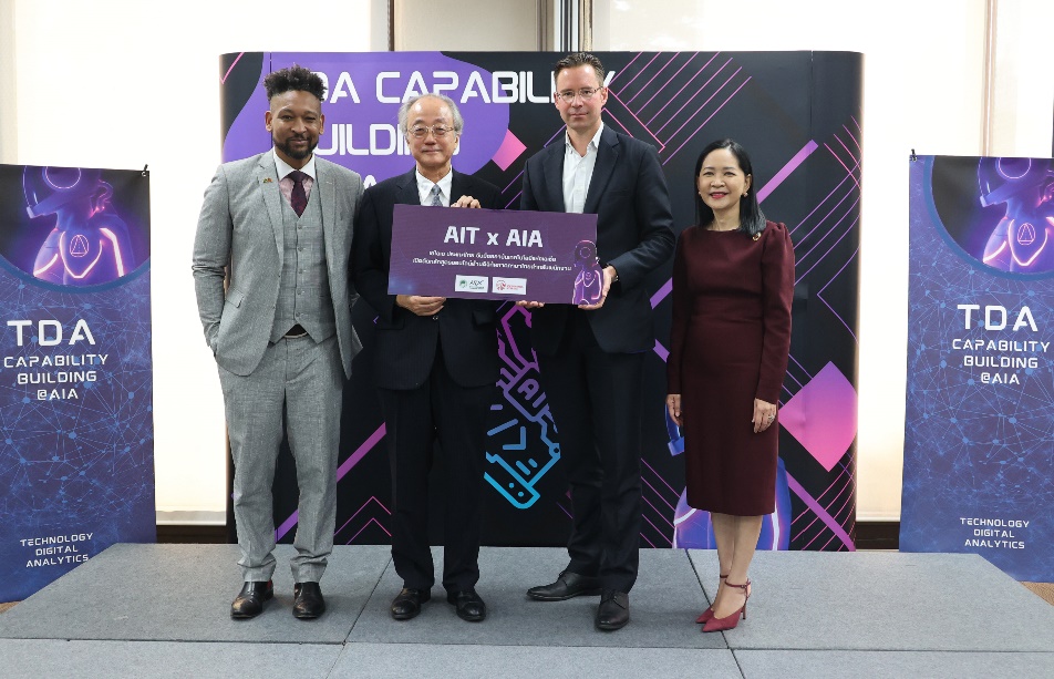 กรุงเทพฯ, 24 พฤศจิกายน 2565 : เอไอเอ ประเทศไทย นำโดย ด็อกเตอร์ คริสเตียน โรแลนด์ (ที่ 2 จากขวา) ประธานเจ้าหน้าที่ฝ่ายกลยุทธ์และดิจิทัล พร้อมด้วย ศรัณยา เทียนถาวร ประธานเจ้าหน้าที่ฝ่ายทรัพยากรบุคคล เดินหน้าขับเคลื่อนพัฒนาบุคลากรให้มีความรู้ ทักษะ ความสามารถด้านเทคโนโลยี ดิจิทัล และการวิเคราะห์ข้อมูล (Technology, Digital and Analytics – TDA) อย่างต่อเนื่อง ล่าสุดได้จับมือกับสถาบันเทคโนโลยีแห่งเอเชีย (Asian Institute of Technology – AIT) สถาบันการศึกษานานาชาติที่มีชื่อเสียงระดับโลกและมีผลงานวิจัยเป็นเลิศ