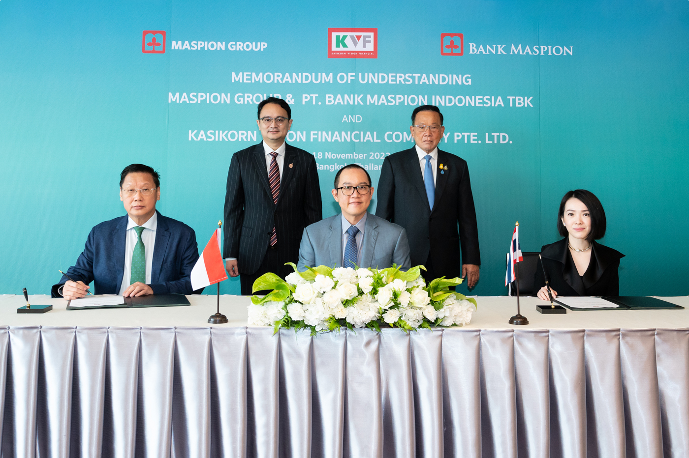 โดยธนาคารกสิกรไทยในฐานะผู้ถือหุ้นในธนาคารแมสเปี้ยน 67.5% จะร่วมพัฒนาผลิตภัณฑ์และบริการทางการเงินในประเทศอินโดนีเซีย พร้อมเชื่อมโยงเครือข่ายการค้า การลงทุน ระหว่างธุรกิจไทย อินโดนีเซีย และภูมิภาค ตอกย้ำบทบาทการเป็นธนาคารแห่งภูมิภาค AEC+ และเสริมสร้างความสัมพันธ์อันดีกับภาครัฐบาลอินโดนีเซีย โดยมี ดร. เจอร์รี่ ซัมบัวกา (ซ้ายบน) รัฐมนตรีช่วยว่าการกระทรวงการค้าอินโดนีเซีย และ สันติ พร้อมพัฒน์ (ขวาบน) รัฐมนตรีช่วยว่าการกระทรวงการคลังของไทยร่วมเป็นพยานในพิธีลงนาม ณ โรงแรมเซ็นทาราแกรนด์ แอท เซ็นทรัลเวิลด์ เมื่อเร็วๆ นี้ ![]()