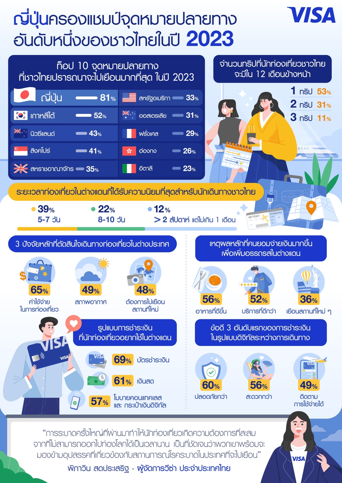 พิภาวิน สดประเสริฐ ผู้จัดการวีซ่า ประจำประเทศไทย กล่าวว่า “การระบาดครั้งใหญ่ที่ผ่านมาก่อให้เกิดความต้องการสะสมในหมู่นักท่องเที่ยวชาวไทย หลังจากที่ไม่สามารถออกไปท่องโลกได้มาเป็นเวลานาน และเมื่อหลายประเทศได้กลับมาเปิดพรมแดนอีกครั้ง เราจึงต้องการจะศึกษาให้ลึกขึ้นถึงพฤติกรรม และความต้องการที่อาจเปลี่ยนแปลงไปของนักท่องเที่ยวชาวไทยในการออกสํารวจโลกแห่งความไม่แน่นอนใบนี้กันอีกครั้ง”