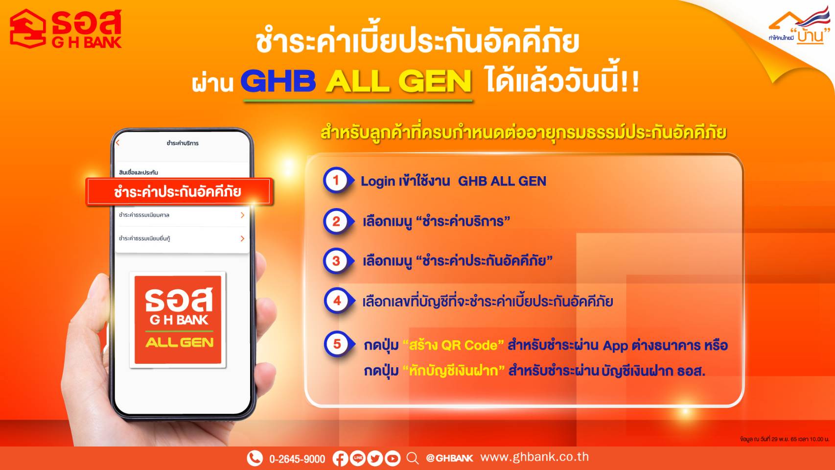 29 พฤศจิกายน 2565 : ธนาคารอาคารสงเคราะห์ (ธอส.) เพิ่มความสะดวกให้กับลูกค้าของธนาคารที่กรมธรรม์ประกันอัคคีภัยครบกำหนดต่ออายุ สามารถทำธุรกรรม “ชำระค่าเบี้ยประกันอัคคีภัย” กับ ธอส. ได้ง่ายๆ ด้วยมือถือเพียงเครื่องเดียวผ่าน Application : GHB ALL GEN โดยไม่ต้องเดินทางมาที่ธนาคาร เพื่อให้ที่อยู่อาศัยที่จดจำนองไว้กับธนาคารได้รับความคุ้มครองตามกรมธรรม์อย่างต่อเนื่องจากเหตุการณ์ที่ไม่คาดคิด อาทิ เหตุวินาศภัย ไฟไหม้ หรือภัยอื่นๆ ให้ได้รับความคุ้มครอง(เงื่อนไขเป็นไปตามความคุ้มครองที่กำหนดไว้) ซึ่งสามารถทำได้ด้วยตนเองง่ายๆ เพียงเลือกเมนู “ชำระค่าบริการ” จากนั้นกด “ชำระค่าประกันอัคคีภัย” และเลือกบัญชีที่จะชำระค่าเบี้ยประกันอัคคีภัย