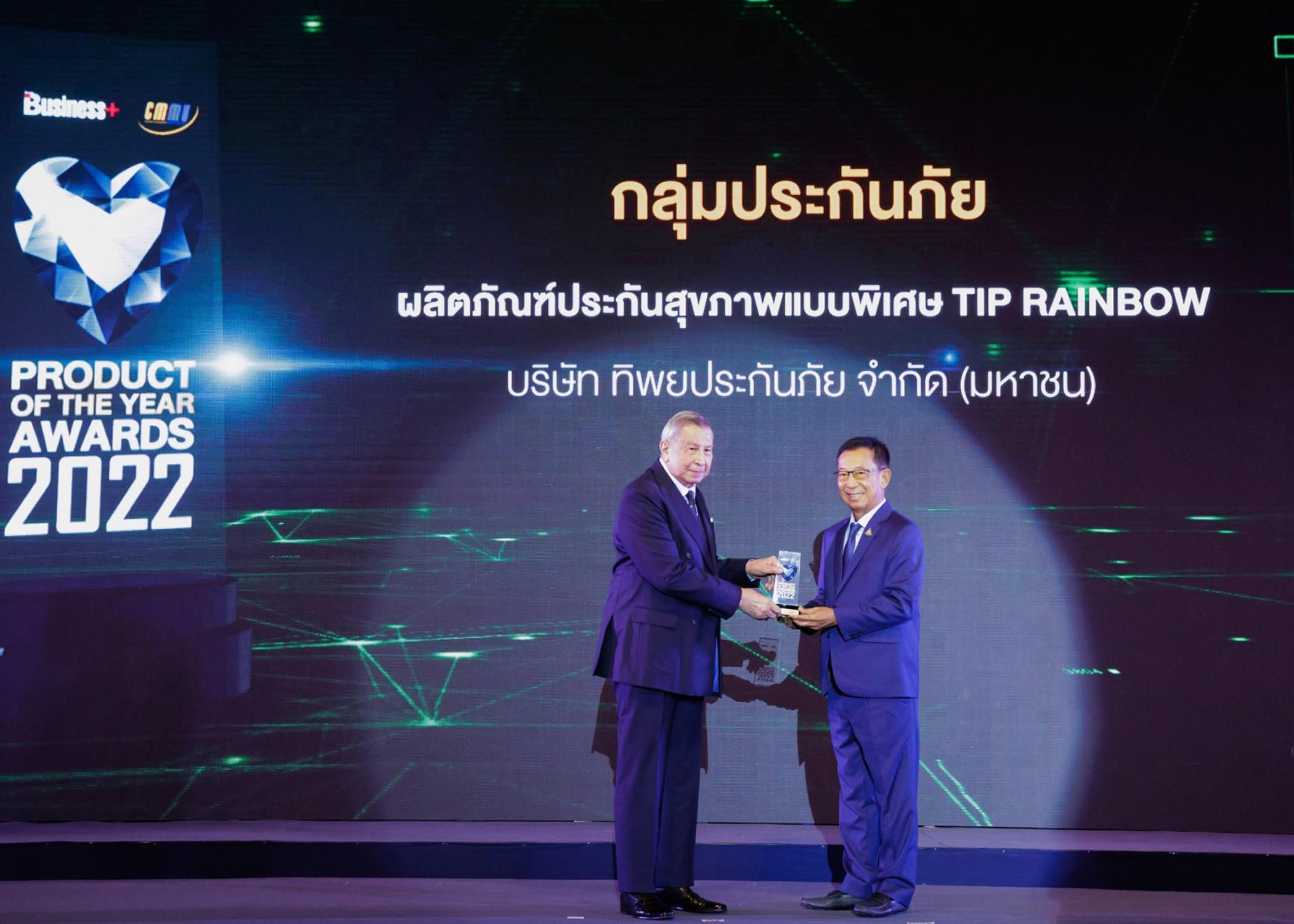 1 ธันวาคม 2565 : พลเอกสมชาย ธนะรัชต์ กรรมการบริษัท บมจ.ทิพยประกันภัย รับรางวัล จาก ฯพณฯ นุรักษ์ มาประณีต องคมนตรี ในฐานะประธานในงาน “BUSINESS+ PRODUCT OF THE YEAR AWARDS 2022” ประเภทสินค้าและบริการกลุ่มประกันยอดเยี่ยมแห่งปี ประกันสุขภาพแบบพิเศษ “TIP RAINBOW”