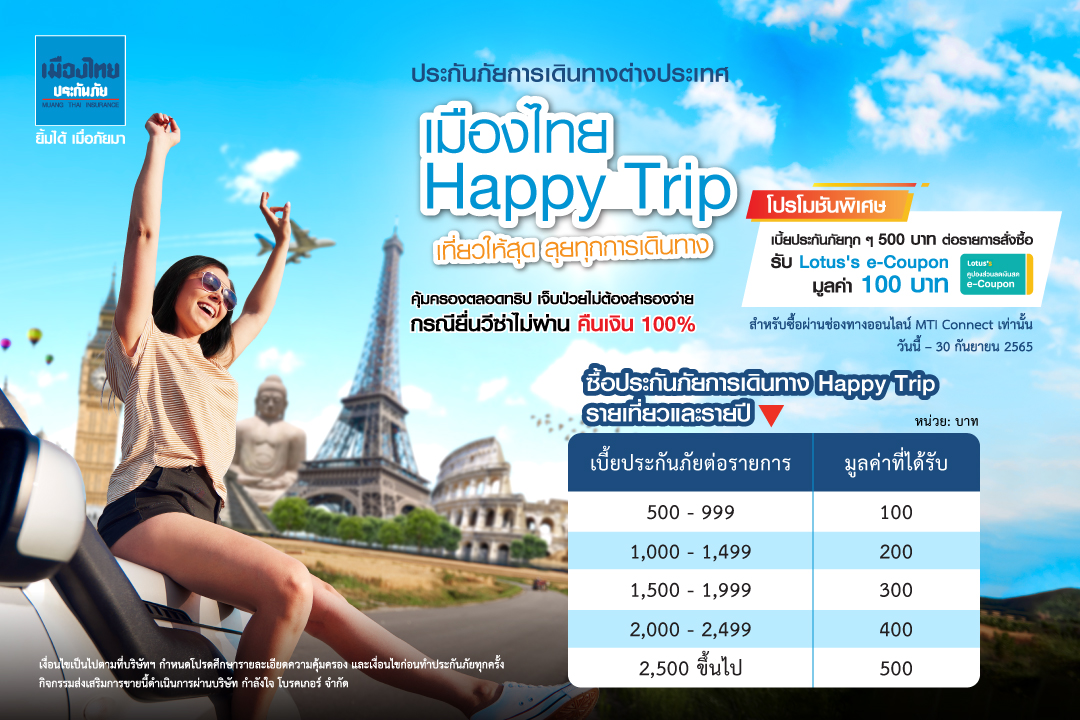 กรุงเทพฯ, 1 ธันวาคม 2565 : นางนวลพรรณ ล่ำซำ กรรมการผู้จัดการ และประธานเจ้าหน้าที่บริหาร บริษัท เมืองไทยประกันภัย จํากัด (มหาชน) กล่าวว่า “ปีที่ผ่านมาหลายประเทศทั่วโลก ทยอยเปิดประเทศต้อนรับนักท่องเที่ยว เพื่อเป็นการกระตุ้นเศรษฐกิจที่ซบเซาจากสถานการณ์โควิด-19 เชื่อว่า หลายๆ คนคงคิดถึงการออกเดินทางการท่องเที่ยว ทั้งในประเทศและต่างประเทศ โดยเฉพาะในเดือนธันวาคม ที่มีวันหยุดสำคัญหลายช่วง เราจึงขอนำเสนอผลิตภัณฑ์ประกันภัยการเดินทางต่างประเทศ “เมืองไทย Happy Trip” ประกันภัยที่ตอบโจทย์นักเดินทาง ที่ทำให้ทุกคนมั่นใจ อุ่นใจ และสนุกกับช่วงเวลานี้อย่างไร้กังวล จะเที่ยวคนเดียวหรือไปแบบครอบครัว ก็พร้อมดูแลอย่างครอบคลุม”
