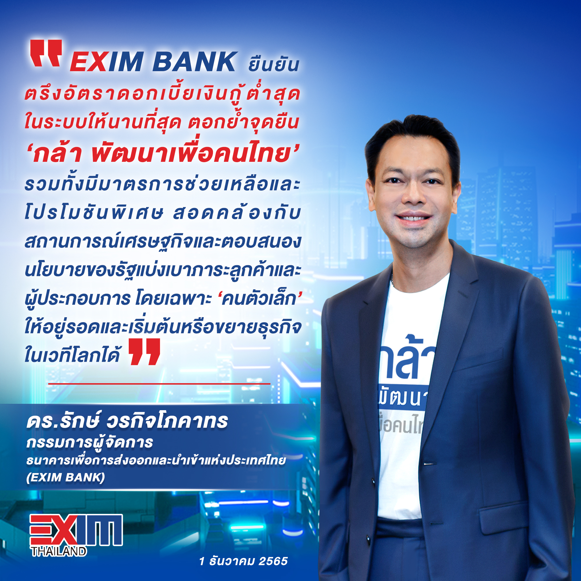 กรุงเทพฯ, 2 ธันวาคม 2565 : ดร.รักษ์ วรกิจโภคาทร กรรมการผู้จัดการ ธนาคารเพื่อการส่งออกและนำเข้าแห่งประเทศไทย (EXIM BANK) เปิดเผยว่า จากที่ประชุมคณะกรรมการนโยบายการเงิน (กนง.) มีมติปรับขึ้นอัตราดอกเบี้ยนโยบาย 0.25% ต่อปีจาก 1.00% เป็น 1.25% ต่อปี “EXIM BANK กล้า พัฒนาเพื่อคนไทย” ด้วยการตรึงอัตราดอกเบี้ยเงินกู้ไว้ให้นานที่สุดในอัตรา Prime Rate 5.75% ต่อปี ซึ่งเป็นอัตราดอกเบี้ยเงินกู้ลูกค้ารายย่อยชั้นดีที่ต่ำที่สุดในระบบ ควบคู่กับการจัดให้มีมาตรการช่วยเหลือและโปรโมชันพิเศษอย่างต่อเนื่อง สอดคล้องกับสถานการณ์เศรษฐกิจทั้งในและต่างประเทศและตอบสนองนโยบายของรัฐบาลในการแบ่งเบาภาระลูกค้าและผู้ประกอบการไทย โดยเฉพาะคนตัวเล็กในกลุ่มเศรษฐกิจฐานรากและ SMEs ให้สามารถอยู่รอดและดำเนินธุรกิจได้ของผู้ประกอบการไทยในโลกยุค Next Normal ![]()