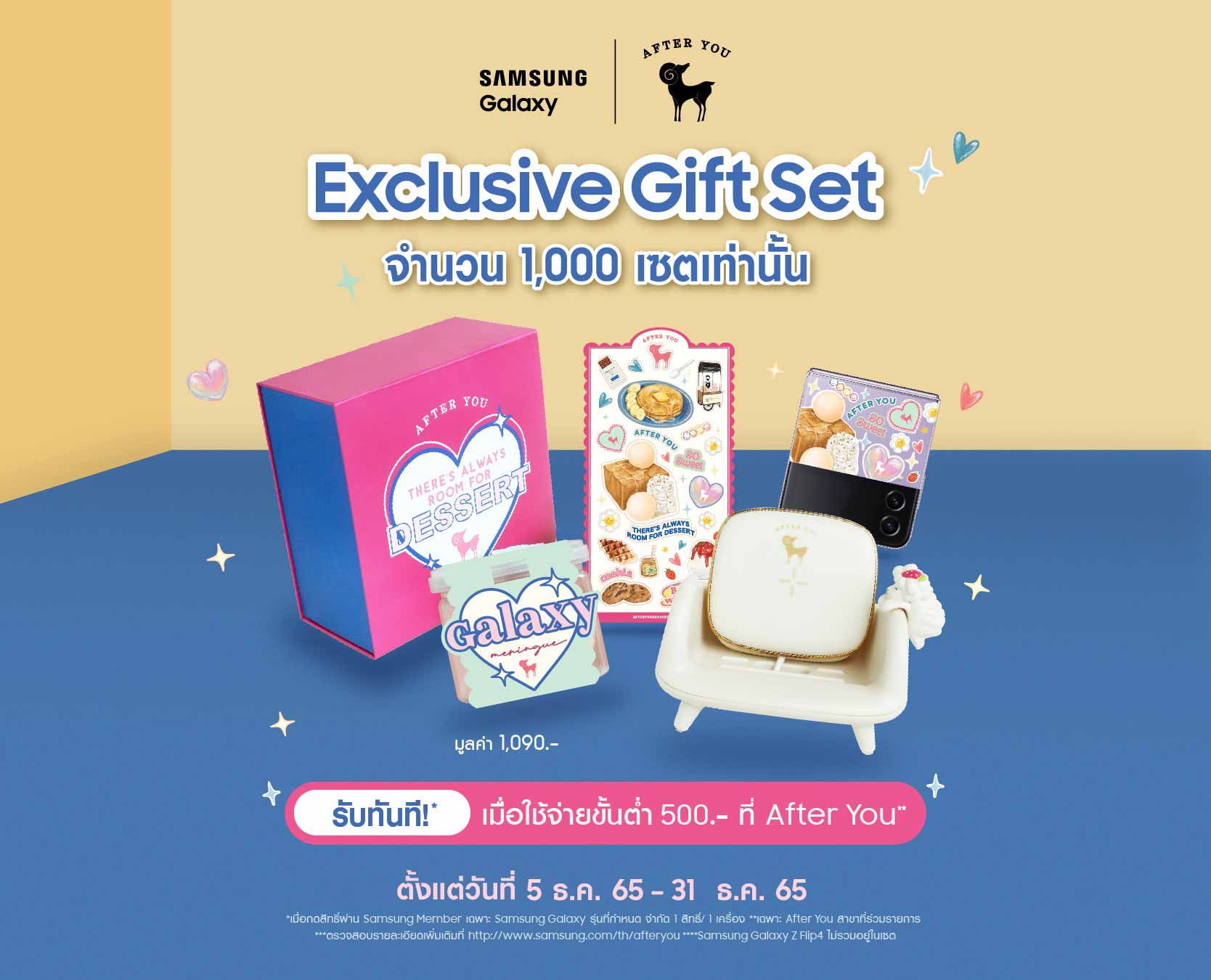 1. สำหรับลูกค้าที่ใช้ Samsung Galaxy รุ่นที่กำหนด เมื่อซื้อสินค้าใดก็ได้ในร้าน After You สาขาที่ร่วมรายการ จำนวนขั้นต่ำตั้งแต่ 500 บาทขึ้นไป ตั้งแต่วันที่ 5 ธ.ค. 65 – 31 ธันวาคม 2565 หรือจนกว่า Exclusive Gift Set จะหมด รับฟรี Exclusive Gift Set มูลค่ารวม 1,090 บาท ประกอบด้วย