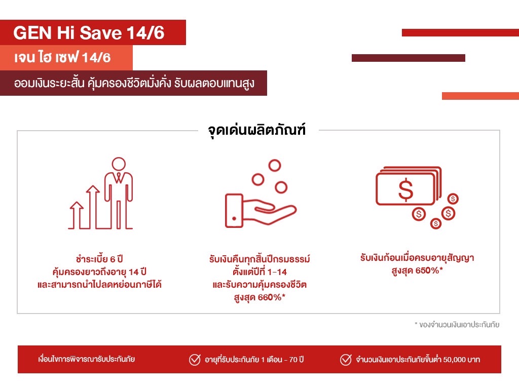 โดยเจนเนอราลี่ ไทยแลนด์ ได้เล็งเห็นถึงปัญหาดังกล่าว เราจึงออกแบบผลิตภัณฑ์ที่ตอบโจทย์ความต้องการของลูกค้าที่หลากหลาย รองรับกับสภาพเศรษฐกิจ และสังคมที่ปรับเปลี่ยนไปตลอดเวลา ด้วยการออกผลิตภัณฑ์ประกันชีวิตประเภทสะสมทรัพย์ “GEN Hi Save 14/6” (เจน ไฮ เซฟ 14/6) เพื่อให้ผู้บริโภคมีทางเลือกในการซื้อประกันชีวิตที่ตรงตามความต้องการ ข้ามขีดจำกัดต่าง ๆ และสอดรับกับนโยบาย ‘Lifetime Partner หรือเพื่อนผู้เคียงข้างลูกค้าในทุกช่วงเวลาของชีวิต’