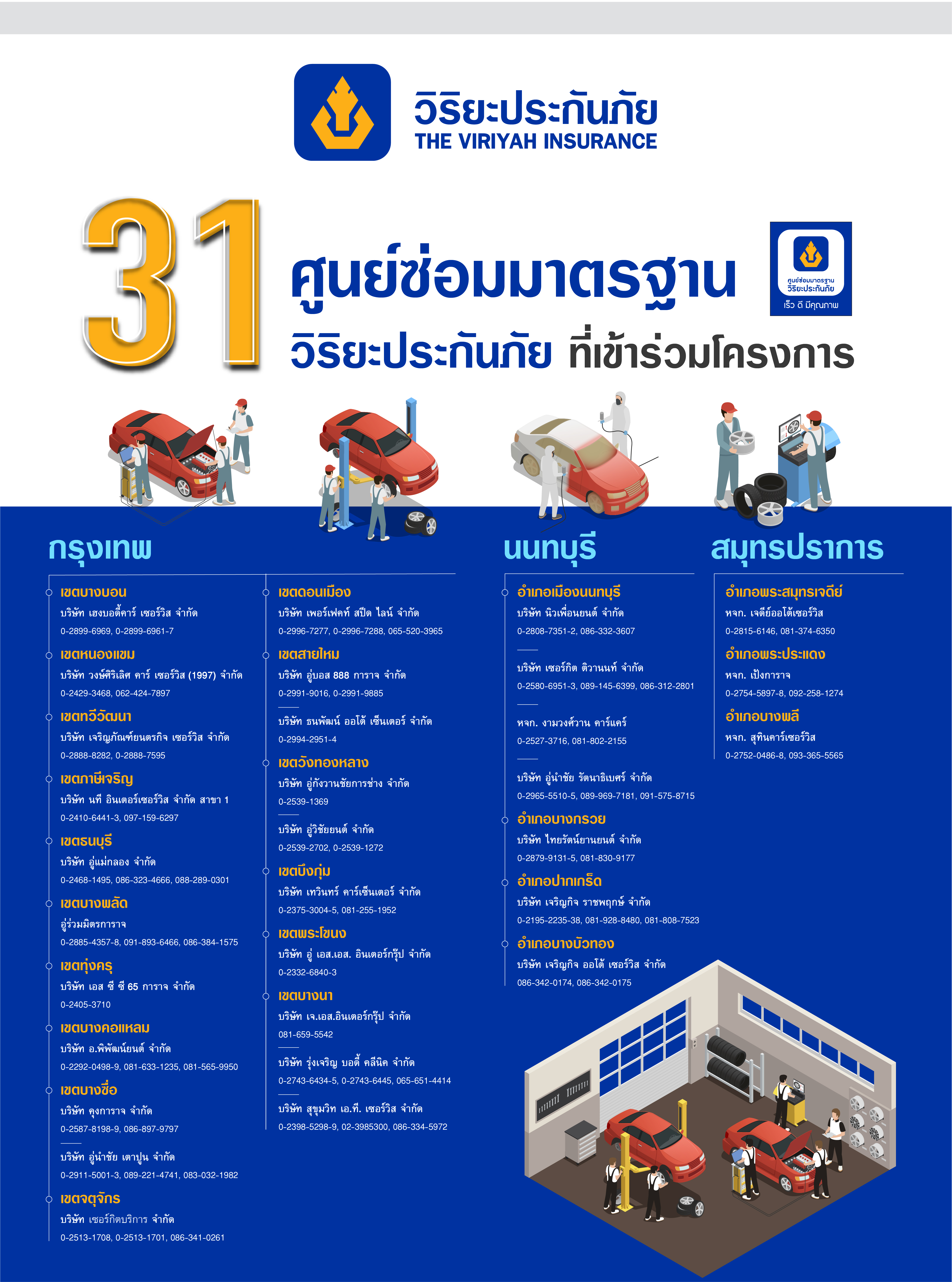 สำหรับศูนย์ซ่อมมาตรฐานวิริยะประกันภัยที่เข้าร่วมโครงการให้บริการตรวจรถฟรี จำนวน 31 แห่ง ได้แก่ 1. บริษัท เฮงบอดี้คาร์ เซอร์วิส จำกัด 2. บริษัท วงษ์ศิริเลิศ คาร์ เซอร์วิส (1997) จำกัด 3. บริษัท เจริญภัณฑ์ยนตรกิจ เซอร์วิส จำกัด 4. บริษัท นที อินเตอร์เซอร์วิส จำกัด สาขา 1 5. บริษัท อู่แม่กลอง จำกัด 6. อู่ร่วมมิตรการาจ 7. บริษัท เอส ซี ซี 65 การาจ จำกัด 8. บริษัท อ.พิพัฒน์ จำกัด 9. บริษัท คุงการาจ จำกัด 10. บริษัท อู่นำชัย เตาปูน จำกัด 11. บริษัทเซอร์กิตบริการ จำกัด 12. บริษัท เพอร์เฟคท์ สปีด ไลน์ จำกัด 13. บริษัท อู่บอส 888 การาจ จำกัด