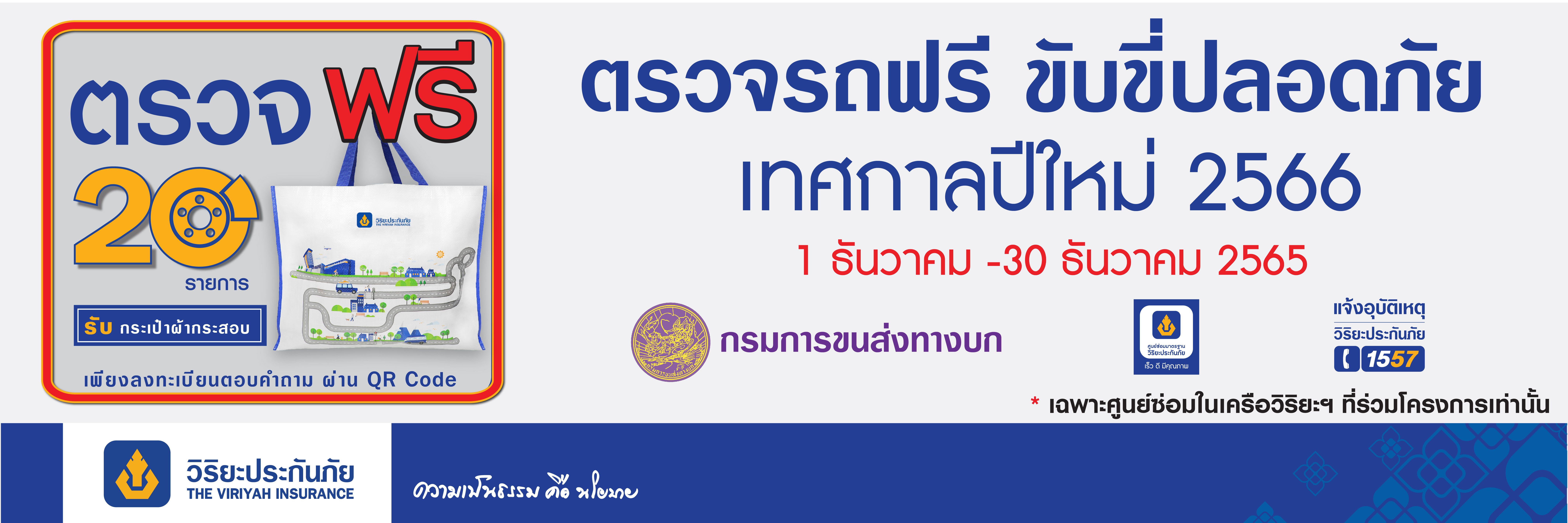 13 ธันวาคม 2565 : วิริยะประกันภัย ร่วมกับ กรมการขนส่งทางบก บูรณาการรณรงค์ความปลอดภัยบนท้องถนน จัดกิจกรรม “ตรวจรถฟรี ขับขี่ปลอดภัย” ช่วงเทศกาลปีใหม่ 2566 มุ่งหวังลดอุบัติเหตุในการใช้รถใช้ถนน และกระตุ้นเตือนให้ประชาชนตระหนักถึงความสำคัญของการตรวจสภาพรถยนต์ ก่อนออกเดินทาง พร้อมให้บริการตรวจสภาพรถยนต์เบื้องต้นฟรี 20 รายการ ณ ศูนย์ซ่อมมาตรฐานวิริยะประกันภัย 31 แห่ง ในพื้นที่กรุงเทพฯ และปริมณฑล วันนี้ถึง 30 ธ.ค. 65