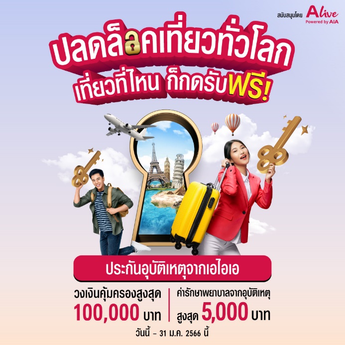 กรุงเทพฯ, 14 ธันวาคม 2565 : เอไอเอ ประเทศไทย ร่วมมือกับ เอ ไลฟ์ (ALive Powered by AIA) โดยบริษัท เอไอเอ เวลเนส จำกัด ส่งความห่วงใยถึงคนไทยทั่วประเทศในช่วงเทศกาลส่งท้ายปีเก่าต้อนรับปีใหม่ 2566 เปิดตัวแคมเปญ “กรมธรรม์ประกันภัยกลุ่มปีใหม่เที่ยวไทยปลอดภัย (ไมโครอินชัวรันส์)” โดย เอ ไลฟ์ ขอมอบกรมธรรม์อุบัติเหตุฟรีให้แก่ประชาชนทั่วไป ระยะเวลาคุ้มครองนาน 30 วัน ด้วยวงเงินคุ้มครองชีวิตสูงถึง 100,000 บาทต่อกรมธรรม์ กรณีเสียชีวิตจากอุบัติเหตุ พร้อมรับผลประโยชน์ค่ารักษาพยาบาลเนื่องจากอุบัติเหตุตามจำนวนที่จ่ายจริงสูงสุด 5,000 บาท*