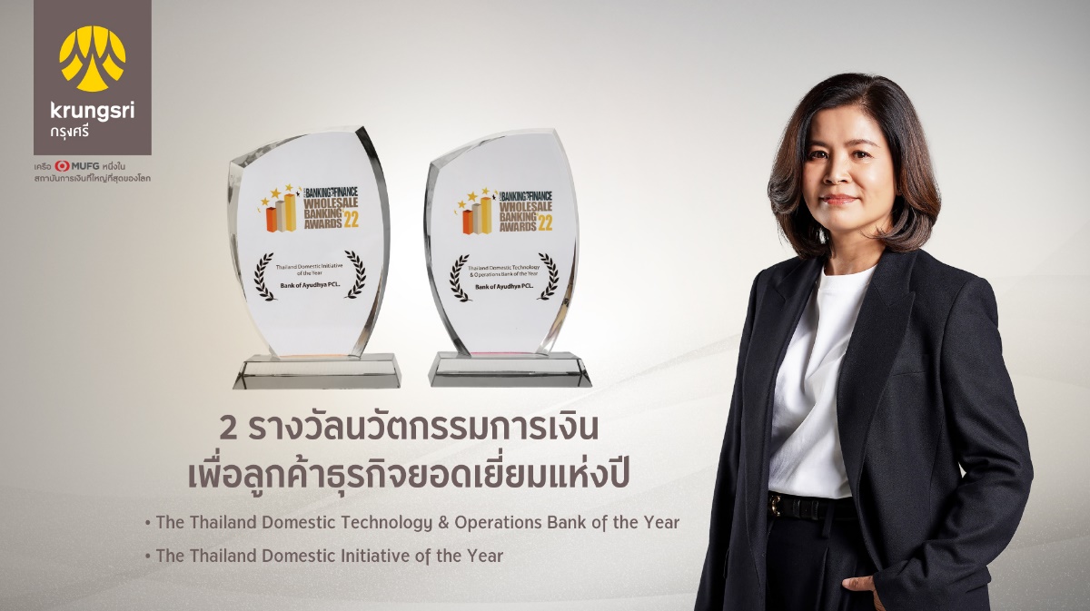 กรุงเทพฯ, 14 ธันวาคม 2565 : กรุงศรี (ธนาคารกรุงศรีอยุธยา จำกัด (มหาชน)) ได้รับสองรางวัลด้านนวัตกรรมการเงินยอดเยี่ยมแห่งปี อย่าง The Thailand Domestic Technology & Operations Bank of the Year และ The Thailand Domestic Initiative of the Year จากงาน The ABF Wholesale Banking Awards 2022