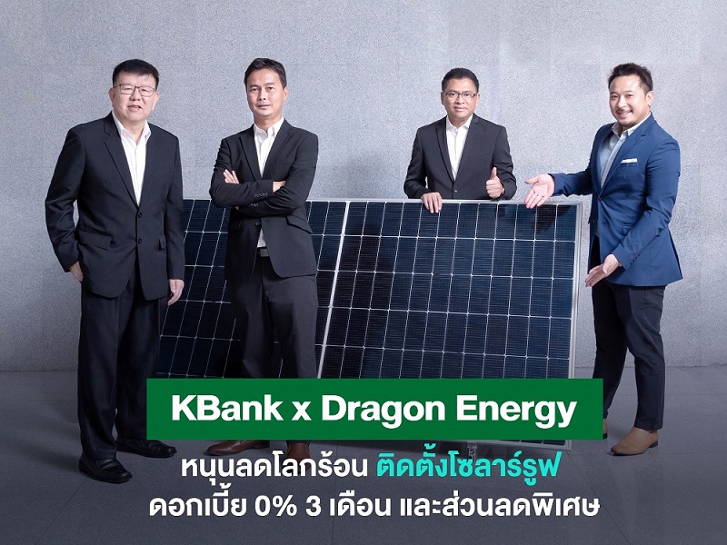 16 ธันวาคม 2565 : ชัยยศ ตันพิสุทธิ์ (ซ้าย) ผู้ช่วยกรรมการผู้จัดการ และ อลงกต บุญมาสุข (ที่ 2 จากขวา) ผู้อำนวยการอาวุโส ฝ่ายบริหารผลิตภัณฑ์และการตลาดสินเชื่อที่อยู่อาศัยและสินเชื่อบุคคลแบบมีหลักประกัน ธนาคารกสิกรไทย ร่วมกับ พลกฤต กล่ำเครือ(ที่ 2 จากซ้าย) กรรมการผู้จัดการ และ บรมวุฒิ หิรัญยัษฐิติ (ขวา) หุ้นส่วนบริหาร บริษัท ดราก้อนเอ็นเนอร์จี เทคโนโลยีแอนด์ ออแกไนท์เซอร์ จำกัด เปิดตัวแคมเปญ “สินเชื่อบ้าน Green Zero” มอบสิทธิพิเศษสำหรับผู้สนใจติดตั้งแผงโซลาร์กับ ดราก้อนเอ็นเนอร์จีฯ ชวนคนไทยใช้ชีวิตกรีน ภายใต้โครงการ GO GREEN Together ของธนาคาร โดยมีโปรโมชันและส่วนลดพิเศษ ดังนี้