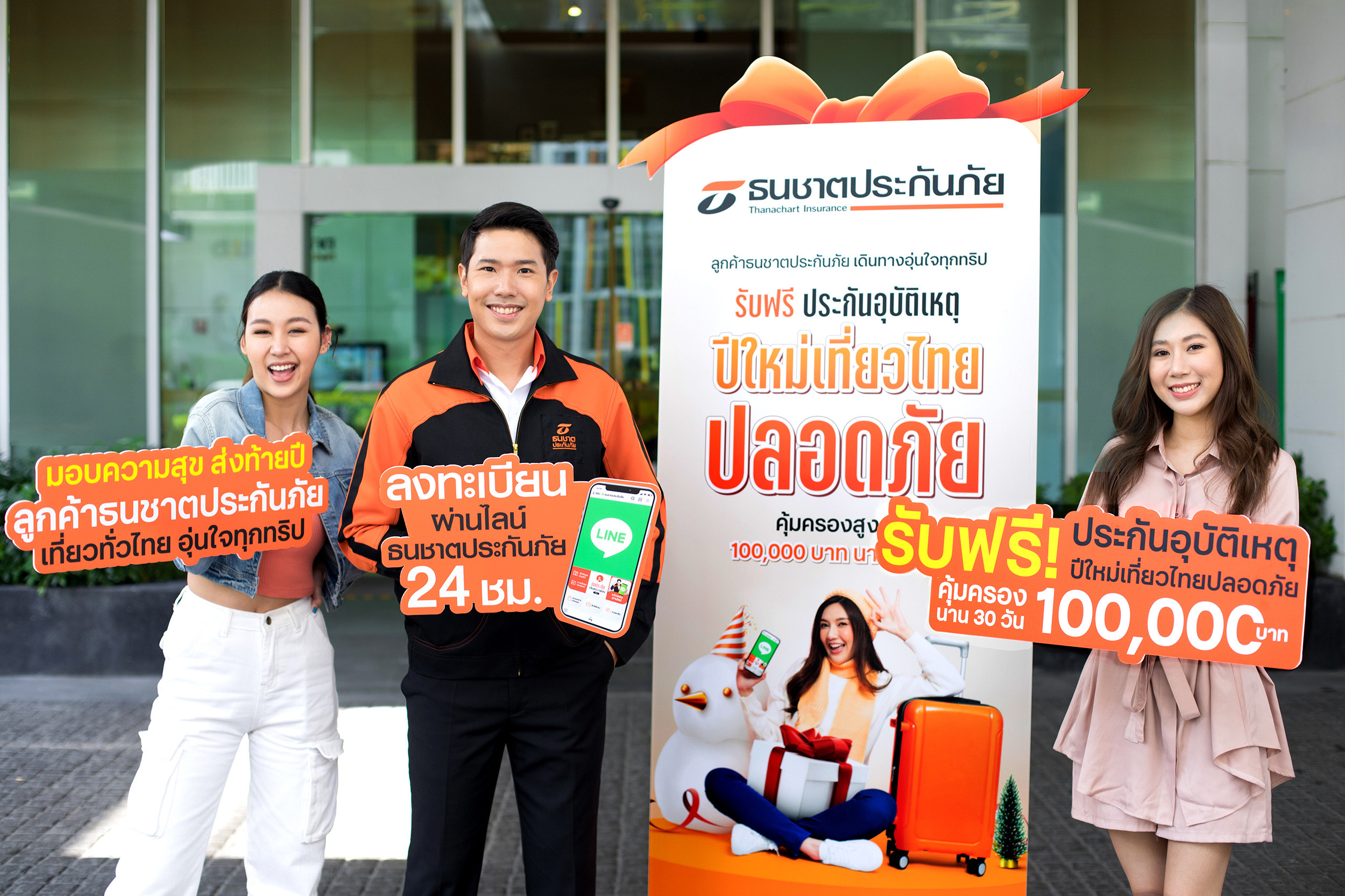 ซึ่งในโอกาสส่งท้ายปีเก่าต้อนรับปีใหม่ บริษัทฯ จึงขอส่งมอบความสุขให้กับลูกค้า โดยเพิ่มความมั่นใจให้กับการเดินทางครั้งนี้ ด้วยการมอบฟรี ประกันภัยอุบัติเหตุ "ปีใหม่เที่ยวไทยปลอดภัย" ที่ให้ความคุ้มครองอุบัติเหตุส่วนบุคคล สูงสุดถึง 100,000 บาท นาน 30 วัน เพื่อให้ลูกค้าของธนชาตประกันภัยมีรอยยิ้มและสนุกไปกับการเดินทางท่องเที่ยวในทุกเส้นทาง