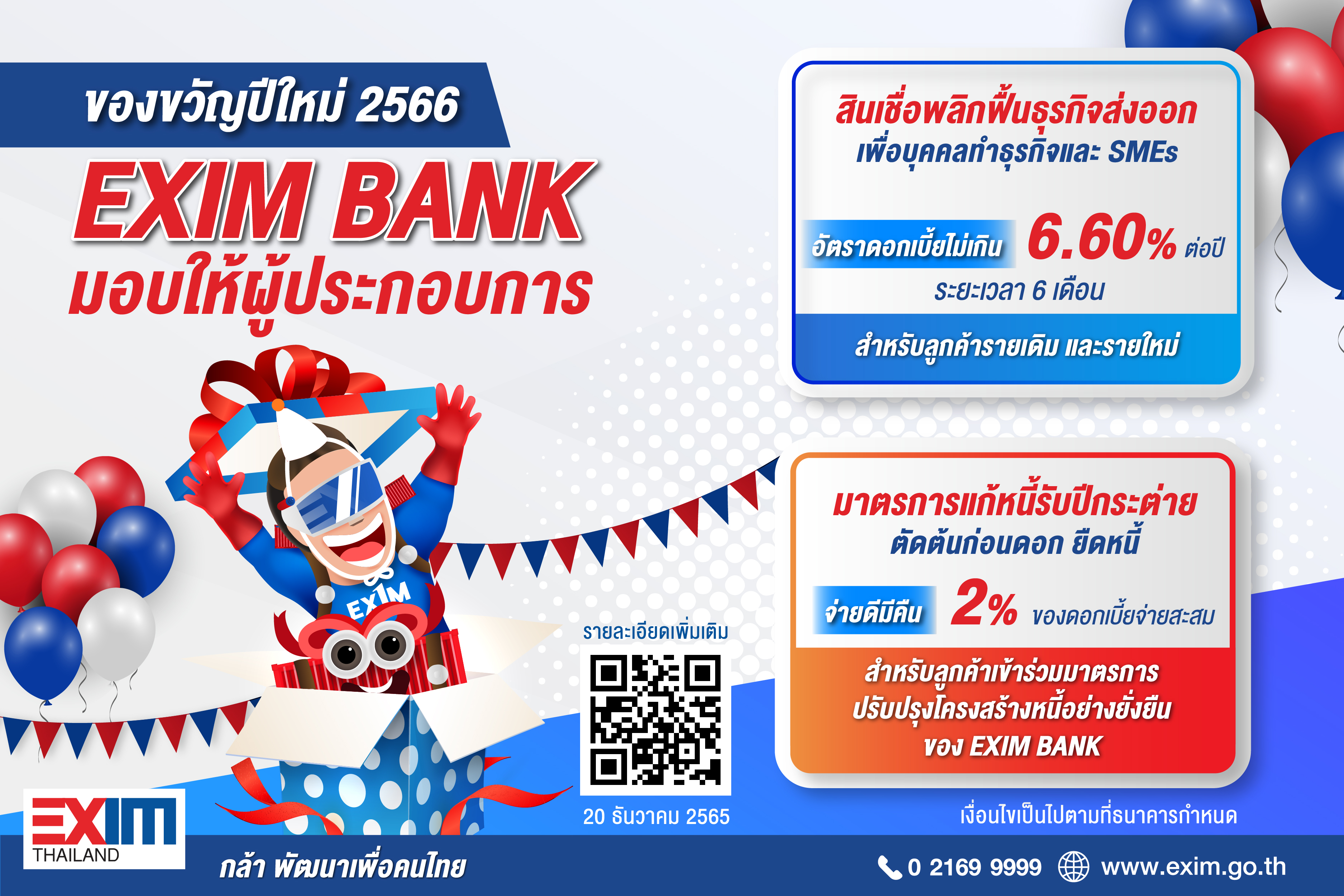 “EXIM BANK ขอส่งความสุขให้แก่ภาคธุรกิจ ด้วยแพ็กเกจของขวัญปีใหม่ ประกอบด้วยสินเชื่อพลิกฟื้นธุรกิจส่งออก อัตราดอกเบี้ยพิเศษ และพิเศษในปีนี้ ธนาคารมีสินเชื่อให้แก่บุคคลธรรมดาที่ทำธุรกิจให้พร้อมเริ่มต้นส่งออกได้ และมาตรการแก้หนี้ ตัดต้นก่อนดอก ยืดหนี้ พร้อมคืนเงิน 2% หากชำระเป็นปกติ เพื่อให้ภาคธุรกิจมีขวัญกำลังใจและสภาพคล่อง รับโอกาสใหม่ ๆ ทางธุรกิจในปีหน้าได้” ดร.รักษ์ กล่าว ![]()