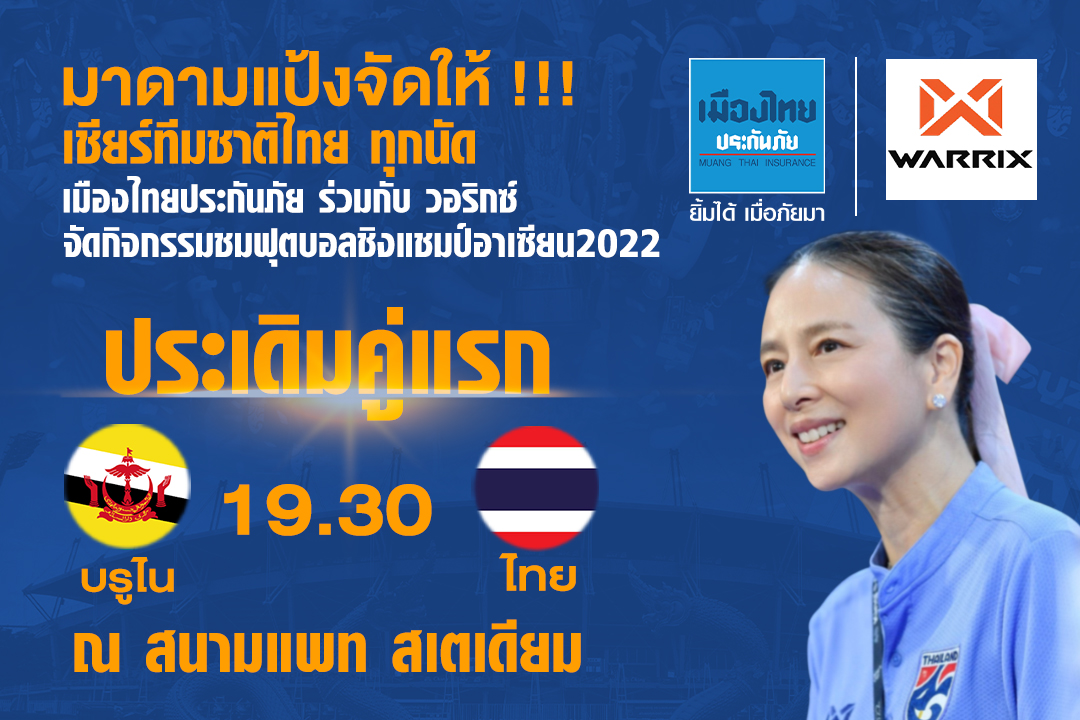 21 ธันวาคม 2565 : “มาดามแป้ง” นวลพรรณ ล่ำซำ ในฐานะผู้จัดการทีมชาติไทย และ CEO บมจ.เมืองไทยประกันภัย ร่วมกับ วอริกซ์ สปอร์ต จำกัด (มหาชน) เตรียมจัดกิจกรรมเพื่อแฟนบอลชาวไทย ด้วยการจัดตั้งจอ LED ที่บริเวณ สนามแพท สเตเดียม เป็นการเปิดโอกาสให้แฟนบอล เชียร์ทัพช้างศึกแบบสด ๆ กับภารกิจป้องกันแชมป์อาเซียน 2022 เริ่มต้นประเดิมเกมบุกเยือน บรูไน ในรอบแบ่งกลุ่ม นัดแรก ช่วงค่ำวันนี้ทันที