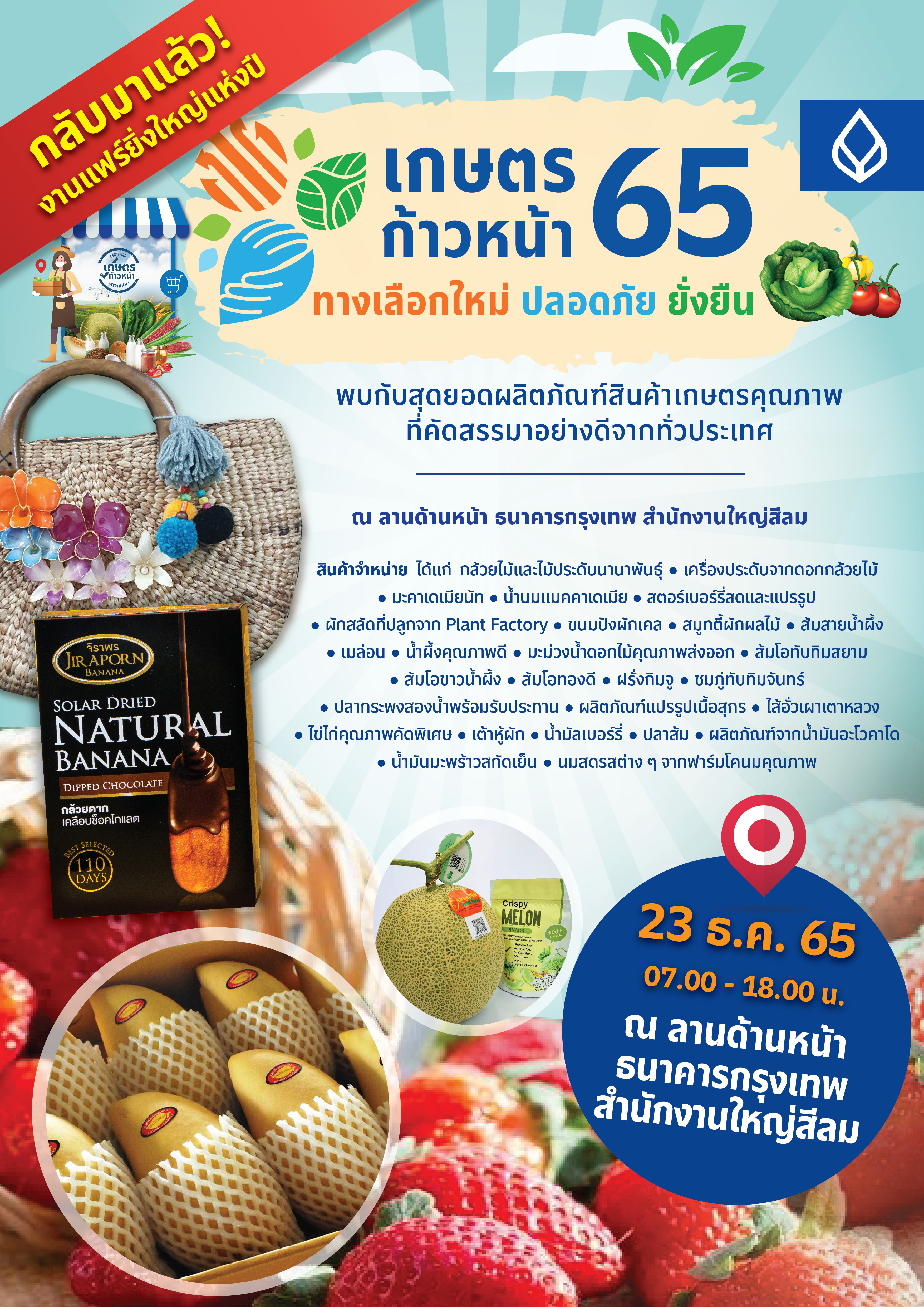 21 ธันวาคม 2565 : ธนาคารกรุงเทพ จำกัด (มหาชน) นำโดย นายเดชา ตุลานันท์ ประธานกรรมการบริหาร และ นายทัฬห์ สิริโภคี ผู้ช่วยผู้จัดการใหญ่ สายลูกค้าธุรกิจรายปลีก จัดงาน “วันเกษตรก้าวหน้า ประจำปี 2565” ภายใต้แนวคิด “ทางเลือกใหม่ ปลอดภัย ยั่งยืน” พบผลผลิตทางการเกษตร สินค้าเกษตรแปรรูปเพื่อสุขภาพ ที่ได้รับมาตรฐานคุณภาพและความปลอดภัยในระดับสากล จากเกษตรกรก้าวหน้า จำนวน 42 ราย/บูธ อาทิ