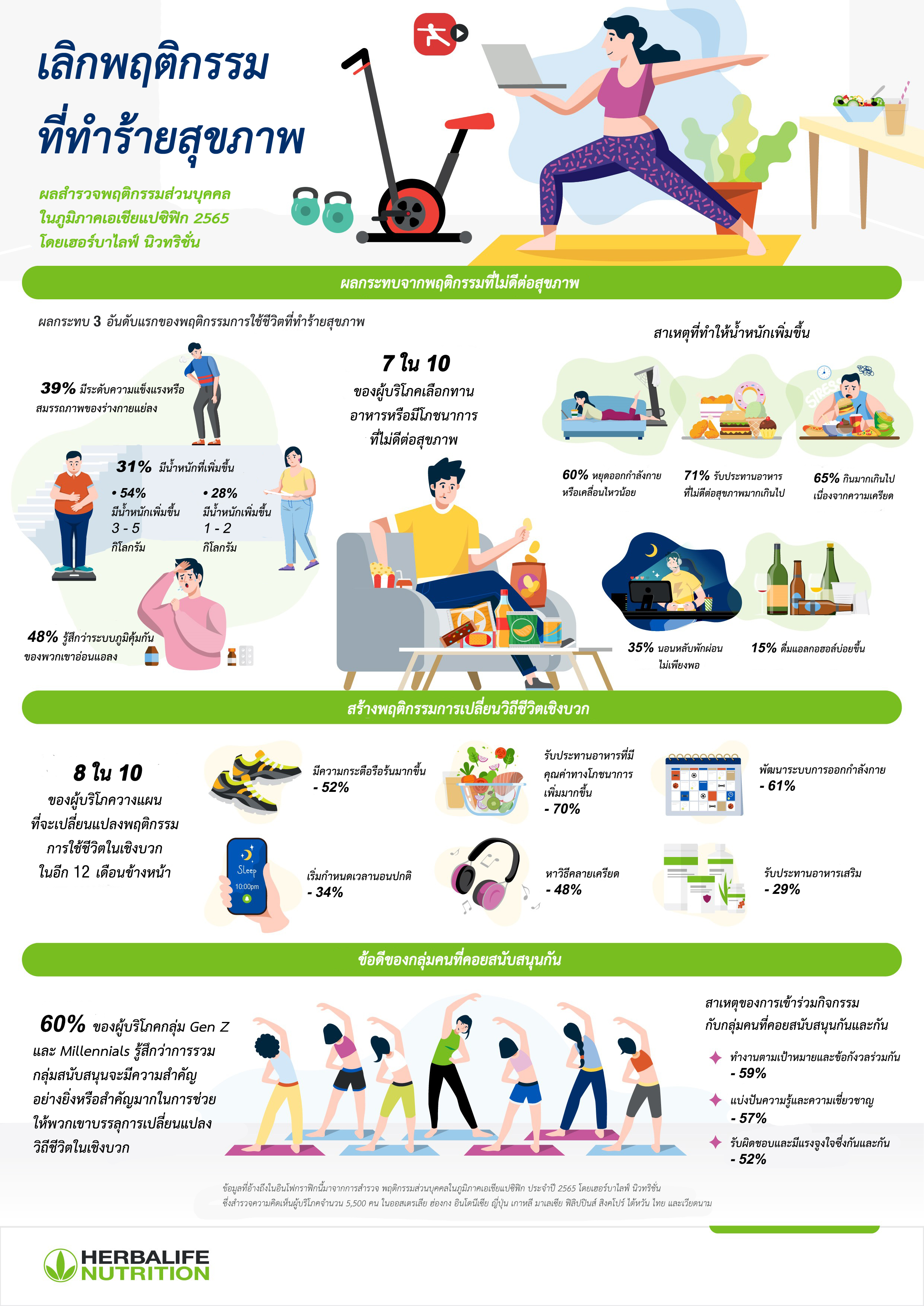 ทั้งนี้ การสำรวจพฤติกรรมส่วนบุคคลประจำภูมิภาคเอเชียแปซิฟิกของเฮอร์บาไลฟ์ นิวทริชั่น จัดทำและดำเนินการในเดือนสิงหาคม 2565 ที่ผ่านมา โดยสำรวจผู้บริโภคจำนวน 5,500 คนที่มีอายุตั้งแต่ 18 ปีขึ้นไปใน 11 ประเทศ ได้แก่ ออสเตรเลีย ฮ่องกง อินโดนีเซีย ญี่ปุ่น เกาหลี มาเลเซีย ฟิลิปปินส์ สิงคโปร์ ไต้หวัน ไทย และเวียดนาม โดยมีวัตถุประสงค์เพื่อเผยแพร่ข้อมูลการเปลี่ยนแปลงพฤติกรรมการใช้ชีวิตของผู้บริโภคในภูมิภาคเอเชียแปซิฟิก และพฤติกรรมที่ทำร้ายสุขภาพที่พวกเขาวางแผนจะเลิกในอีก 12 เดือนข้างหน้า ![]()