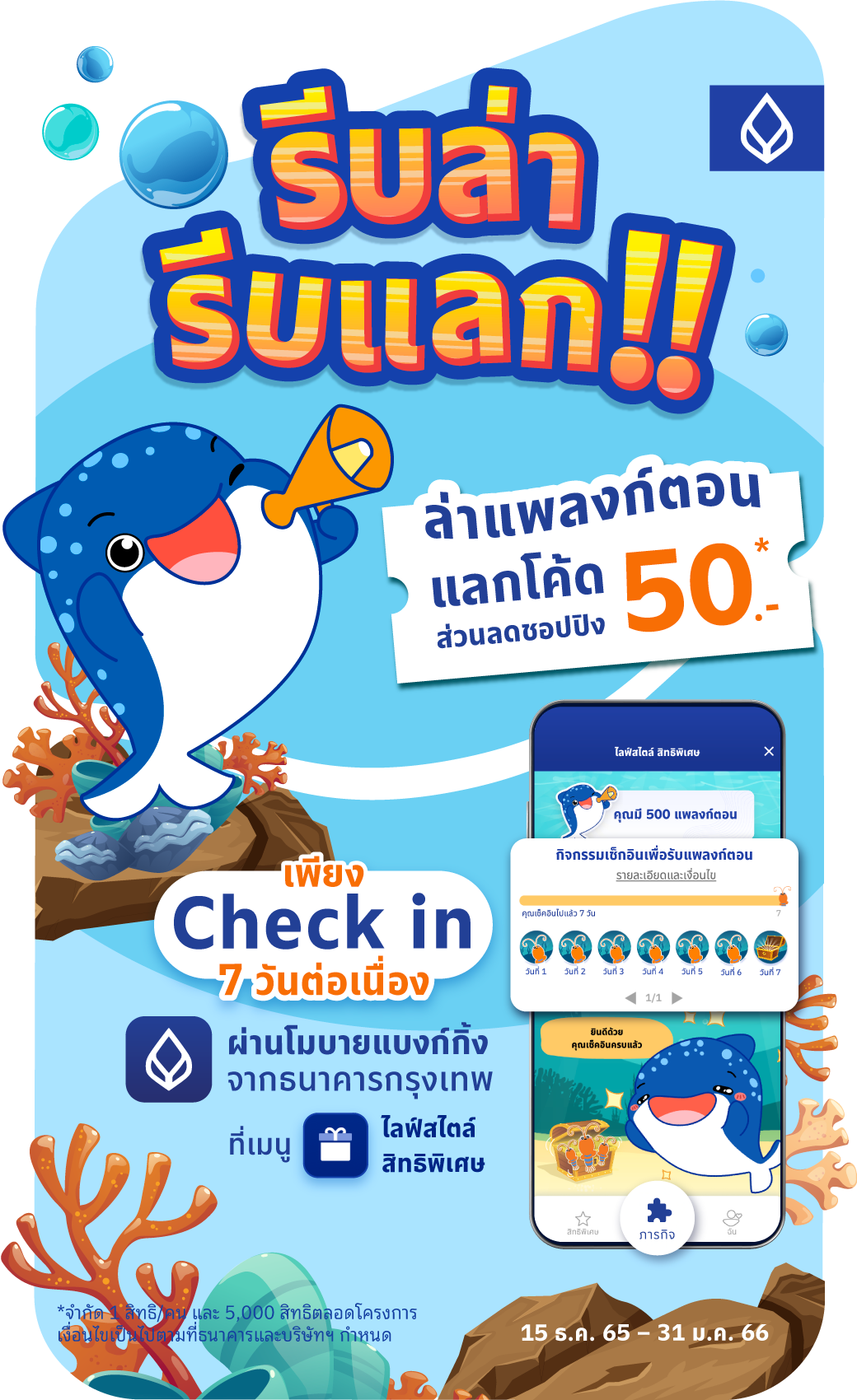 ง่ายๆ เพียงช่วยกันล่าแพลงก์ตอน อาหารจานโปรดของ ‘น้องจุด’ ด้วยการเช็กอิน (Check in) 7 วันต่อเนื่อง ผ่านโมบายแบงก์กิ้ง จากธนาคารกรุงเทพ ในเมนู ‘ไลฟ์สไตล์ สิทธิพิเศษ’ รับทันที! 500 แพลงก์ตอน เพื่อนำไปแลกรับโค้ดส่วนลดชอปปิงออนไลน์* มูลค่า 50 บาท