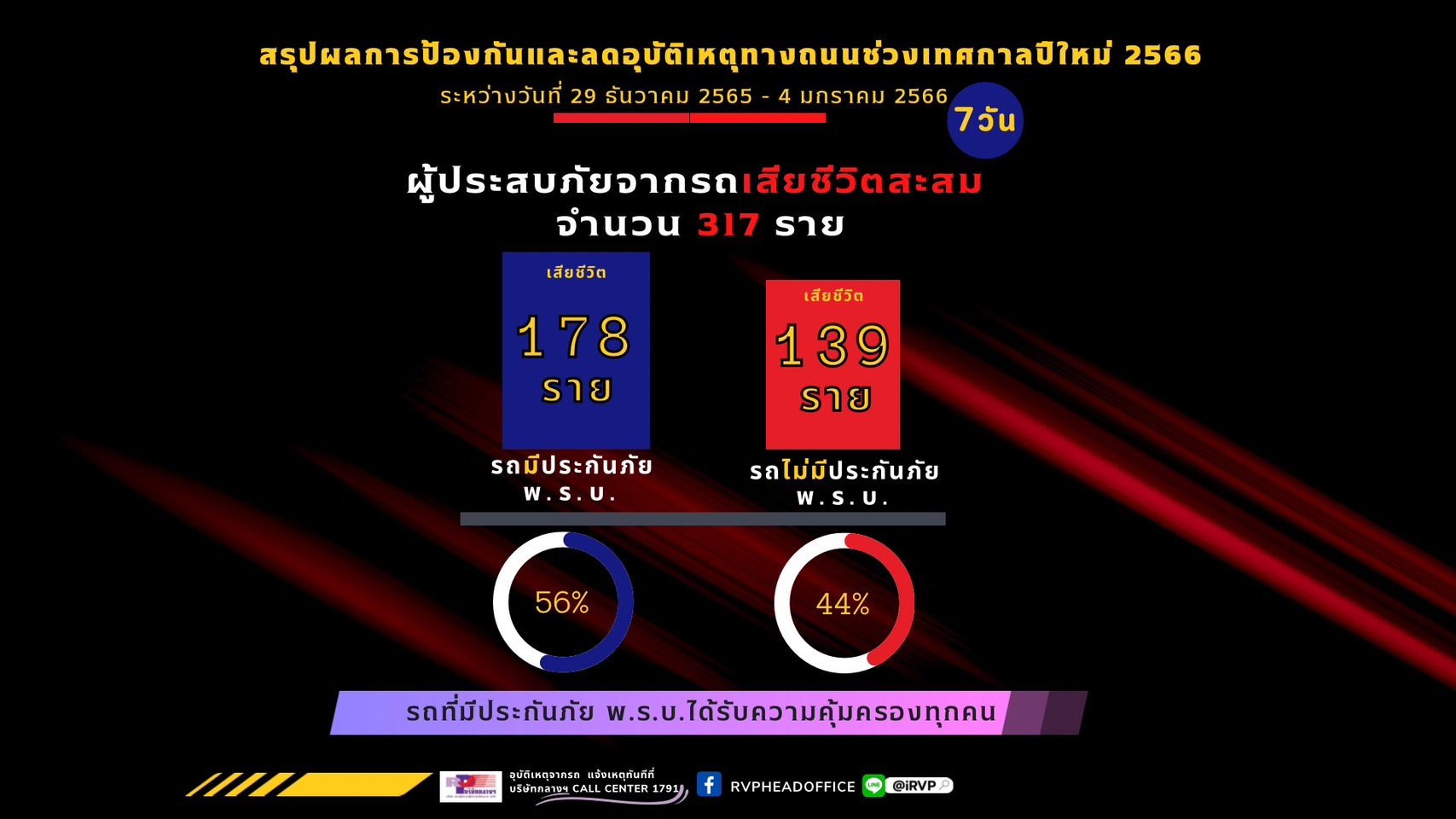 สำหรับผู้เสียชีวิตจากอุบัติเหตุทางถนนในช่วงเทศกาลปีใหม่นี้ พบว่ามีผู้เสียชีวิตจากรถมีประกันภัย พ.ร.บ.จำนวน 178 ราย และเสียชีวิตจากรถที่ยังไม่พบการมีประกันภัย พ.ร.บ.อีกจำนวน 139 ราย