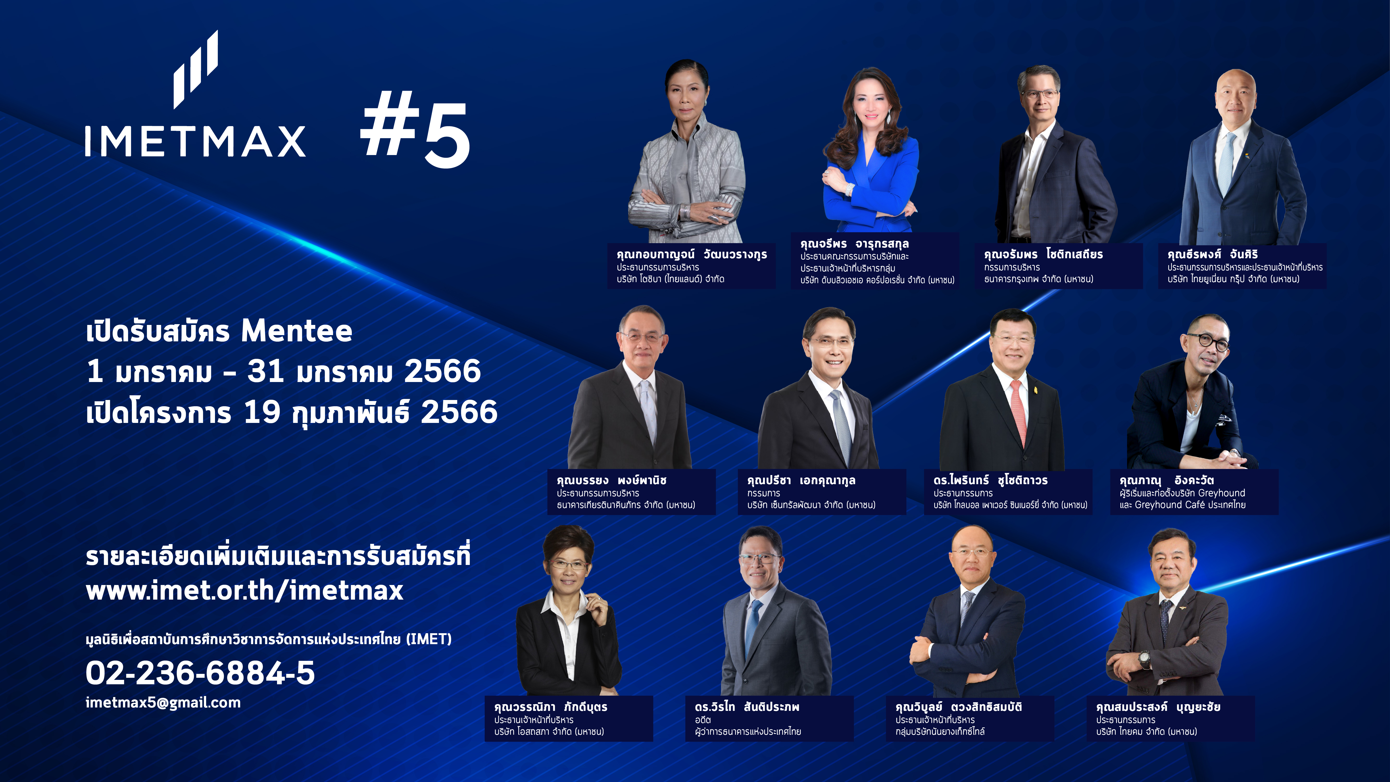 9 มกราคม 2566 : มูลนิธิเพื่อสถาบันการศึกษาวิชาการจัดการแห่งประเทศไทย (IMET) มุ่งสร้างอุทยานผู้นำ เพื่อเป็นศูนย์รวมผู้นำของชาติและเป็นศูนย์กลางการบ่มเพาะผู้นำรุ่นใหม่ให้ก้าวสู่ความเป็นผู้นำที่พร้อมทั้งความเก่งและความดี ควบคู่ไปกับการตอบแทนคุณสู่สังคมไทยได้ ผ่านโครงการ “IMET MAX” ที่รวมเหล่าผู้บริหารระดับสูงจากหลากหลายองค์กรชั้นนำของประเทศมาเป็น “เมนเทอร์” (Mentor) ถ่ายทอดประสบการณ์อันมีค่าที่สะสมมายาวนาน ตลอดทั้งให้คำชี้แนะ ให้คำปรึกษา ให้มุมมองสะท้อนย้อนคิด (Reflection) และสร้างแรงบันดาลใจให้กับ “เมนที” (Mentee) ซึ่งเป็นผู้นำรุ่นใหม่ที่มีศักยภาพสูงของสังคม โดยล่าสุด พร้อมเดินหน้าสู่ปีที่ 5 “IMET MAX 5” ดึง 12 ผู้บริหารชั้นนำระดับประเทศร่วมเป็นเมนเทอร์ (Mentor)