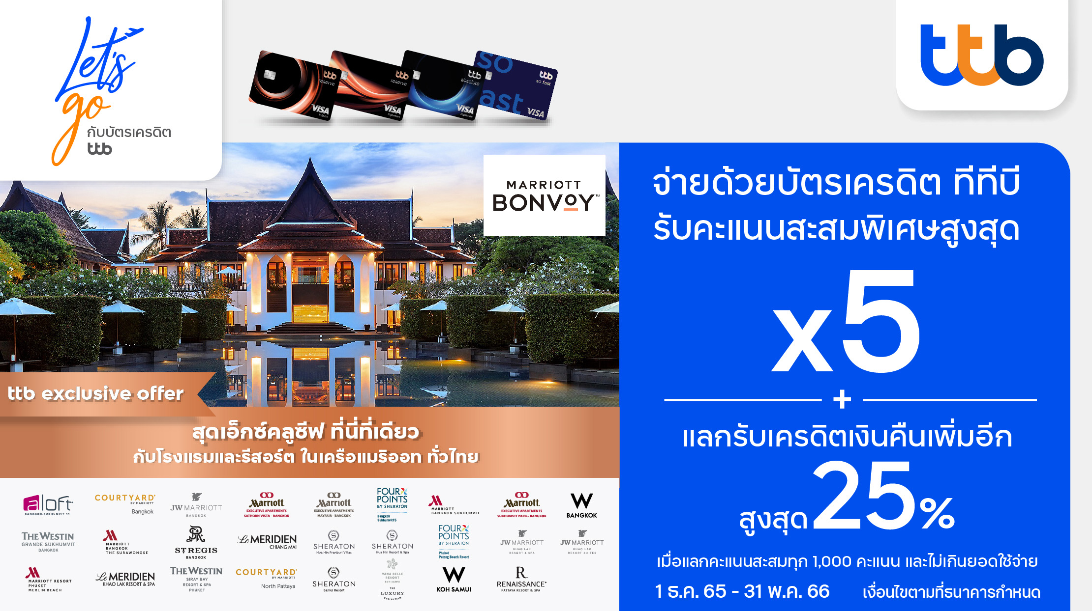 13 มกราคม 2566 : บัตรเครดิต ทีทีบี มอบสิทธิพิเศษสำหรับผู้ถือบัตรเครดิต ทีเอ็มบี และบัตรเครดิต ธนชาต เมื่อใช้บริการที่โรงแรมและรีสอร์ตในเครือแมริออททั่วประเทศ ระหว่างวันที่ 1 ธันวาคม 2565 – 31 พฤษภาคม 2566 ด้วยสิทธิพิเศษดังนี้