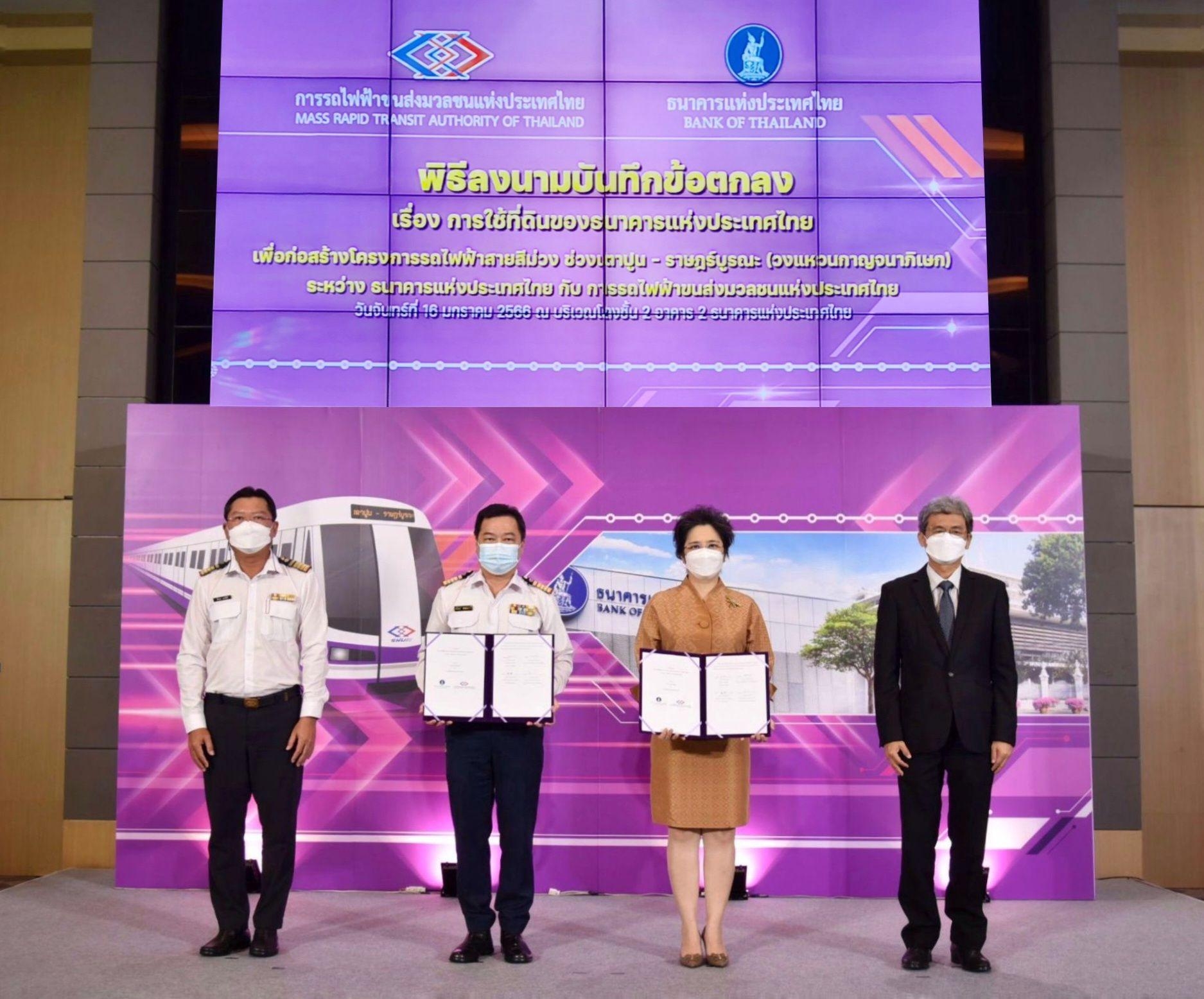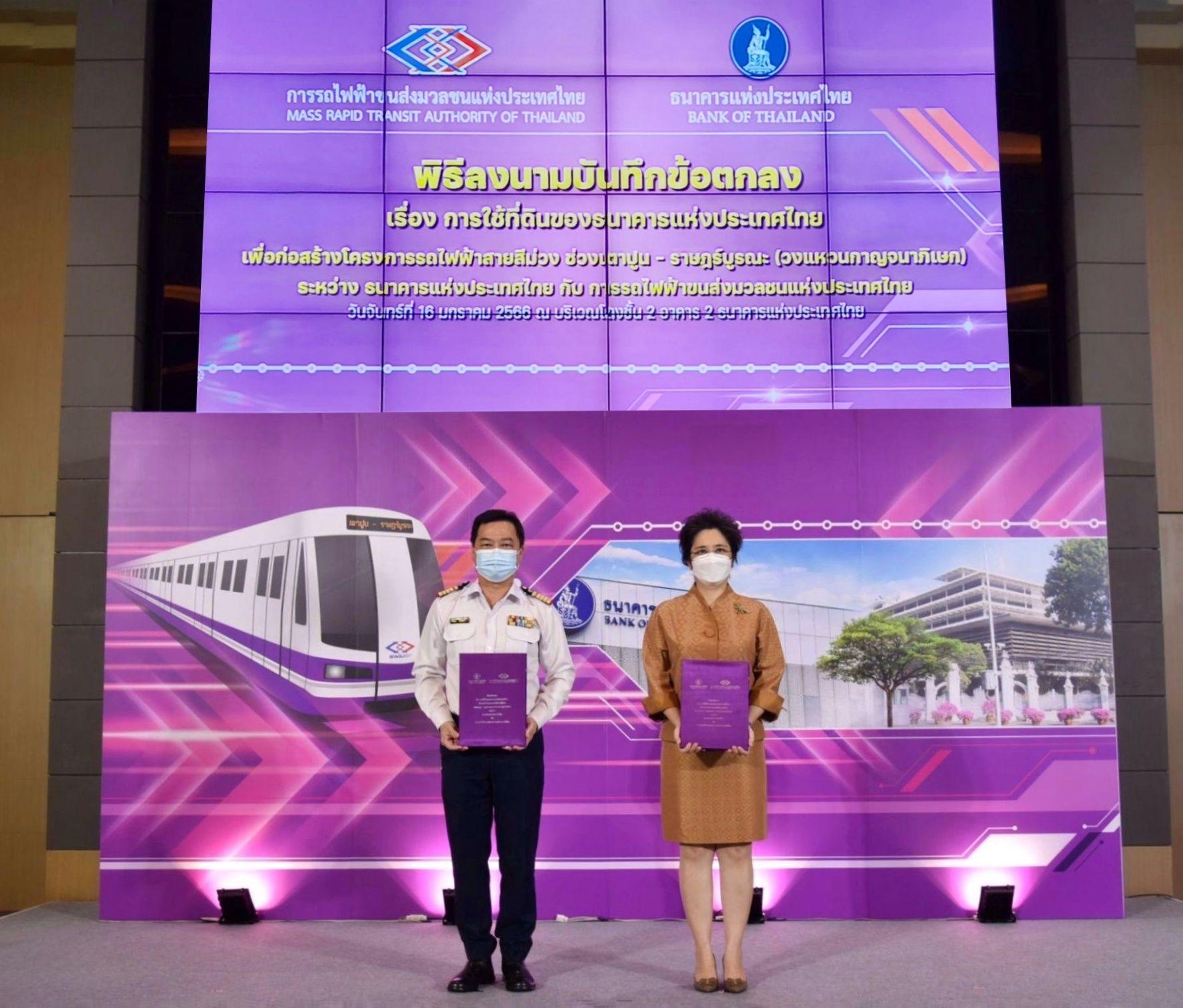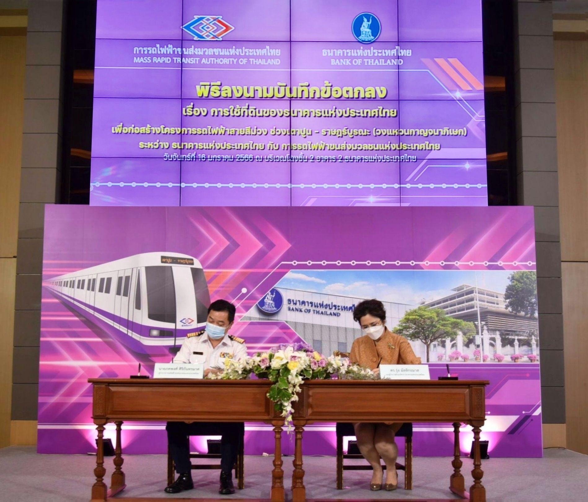 16 มกราคม 2566 : นายภคพงศ์ ศิริกันทรมาศ ผู้ว่าการการรถไฟฟ้าขนส่งมวลชนแห่งประเทศไทย (รฟม.) และ นางรุ่ง มัลลิกะมาส รองผู้ว่าการ ด้านบริหาร ธนาคารแห่งประเทศไทย (ธปท.) ได้ร่วมลงนามบันทึกข้อตกลง (MOU) ว่าด้วยการใช้ที่ดินของ ธปท. เพื่อก่อสร้างโครงการรถไฟฟ้าสายสีม่วง ช่วงเตาปูน – ราษฎร์บูรณะ (วงแหวนกาญจนาภิเษก) ณ อาคาร 2 ธปท.